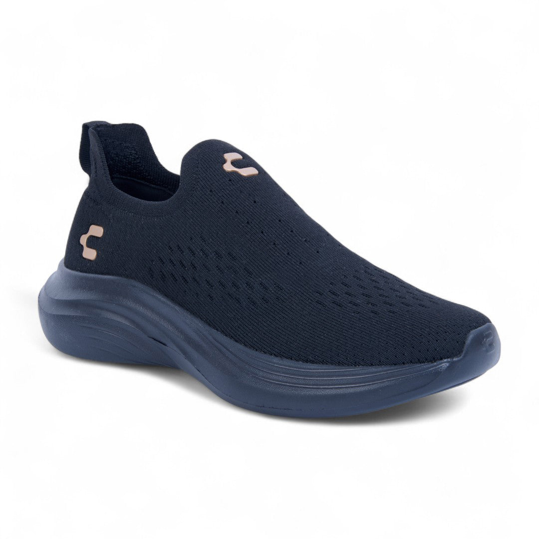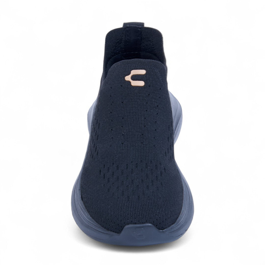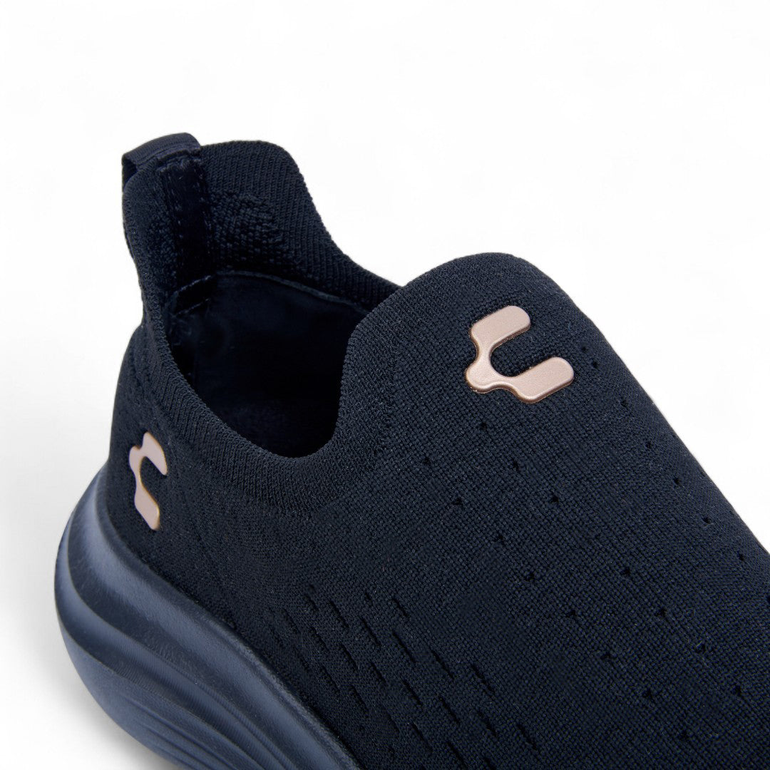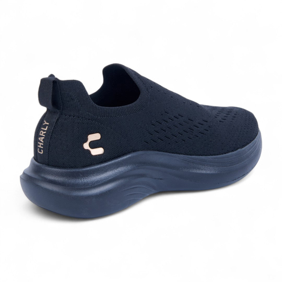 Tenis Charly negro slip-in con malla transpirable, suela ligera confortable y diseño minimalista ideal para uso diario o caminata urbana.
