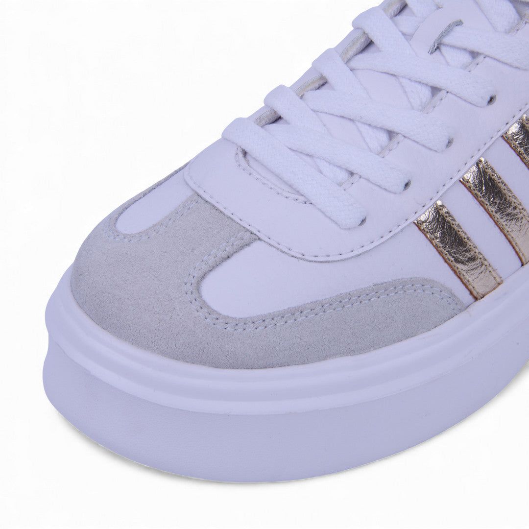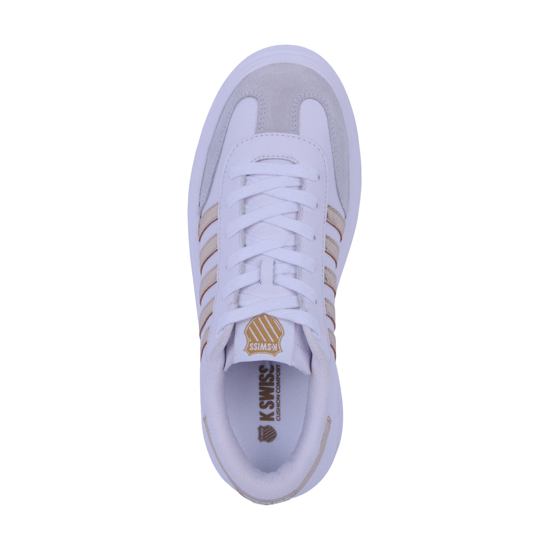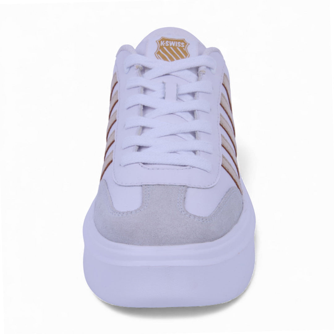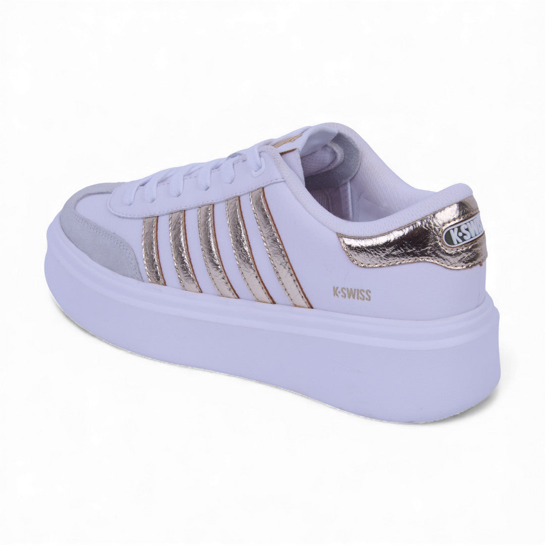 Tenis K-Swiss blanco con logo en lengüeta, cordones ajustables, jalador posterior y líneas laterales en contraste; con plantilla cushion comfort para máximo confort diario.