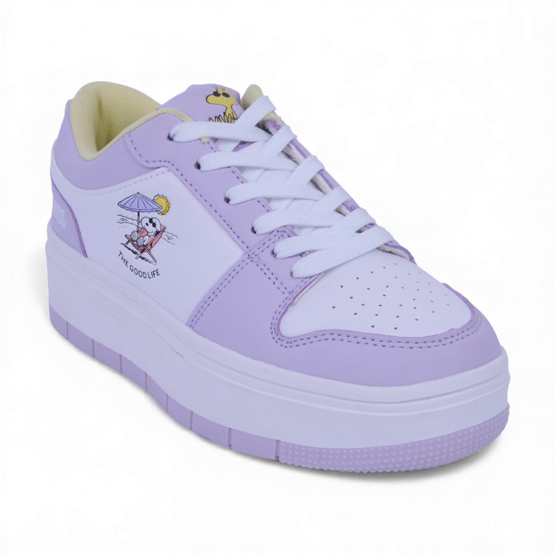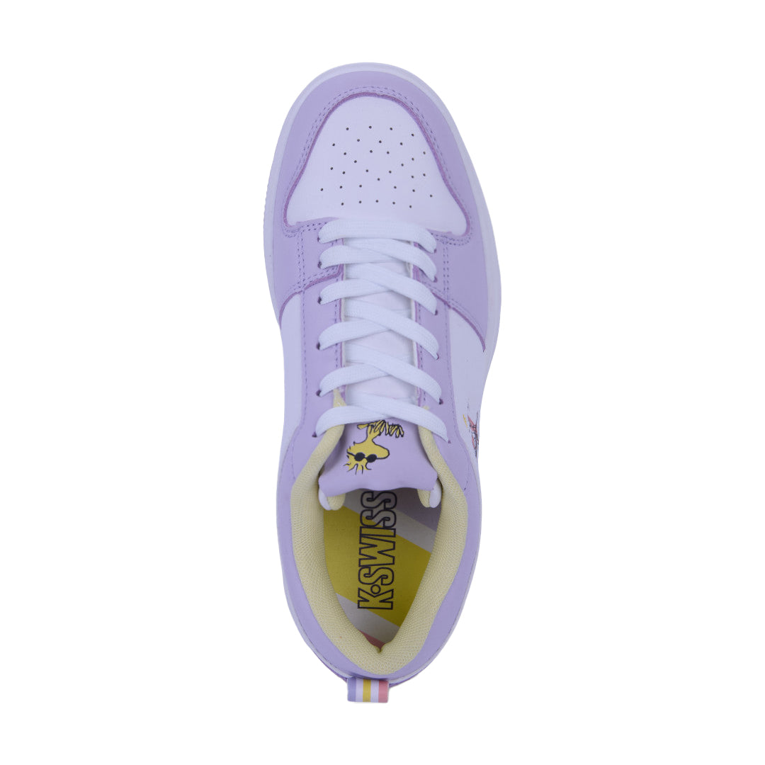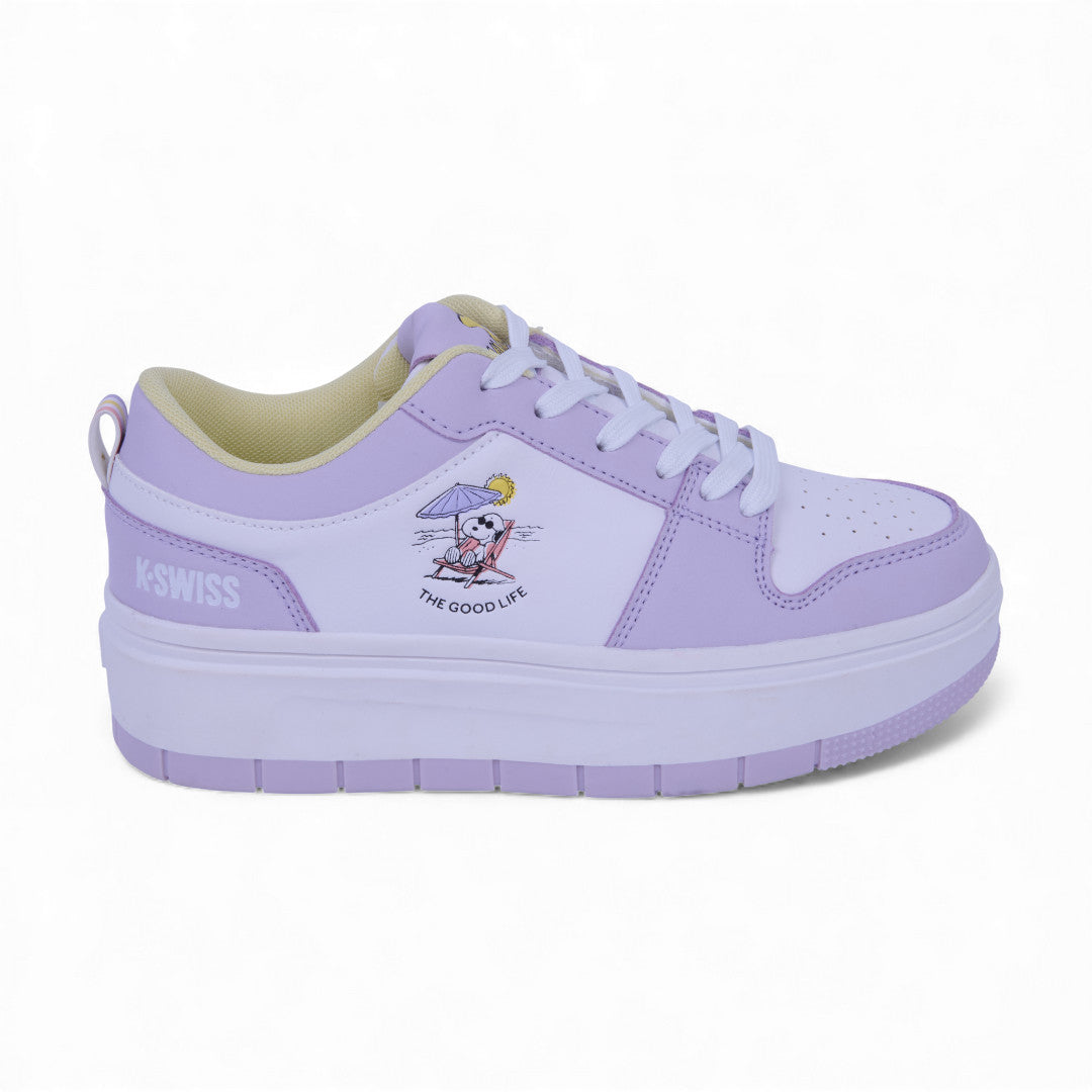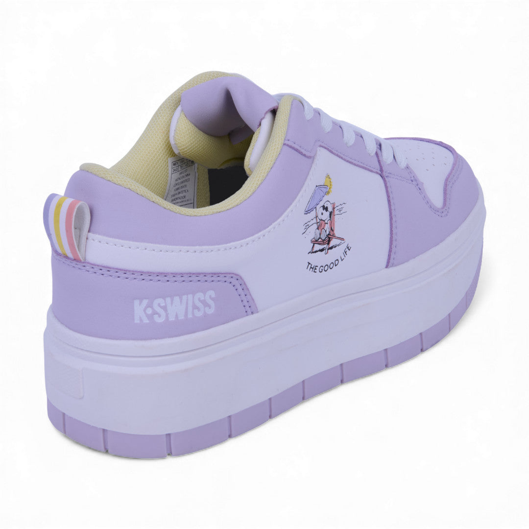 Tenis K-Swiss multicolor con estampado Snoopy, jalador posterior y plataforma de 3.5 cm; divertido, cómodo y perfecto para uso diario.