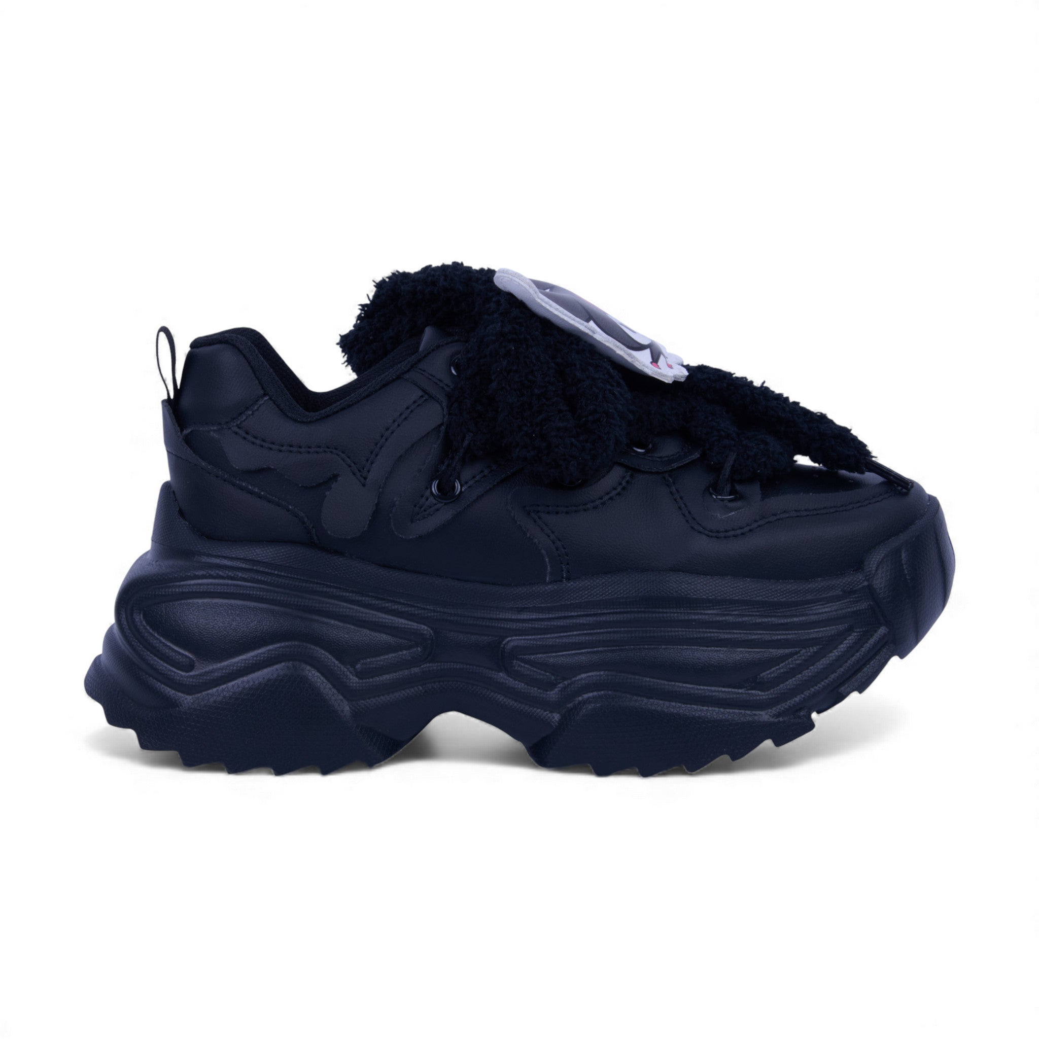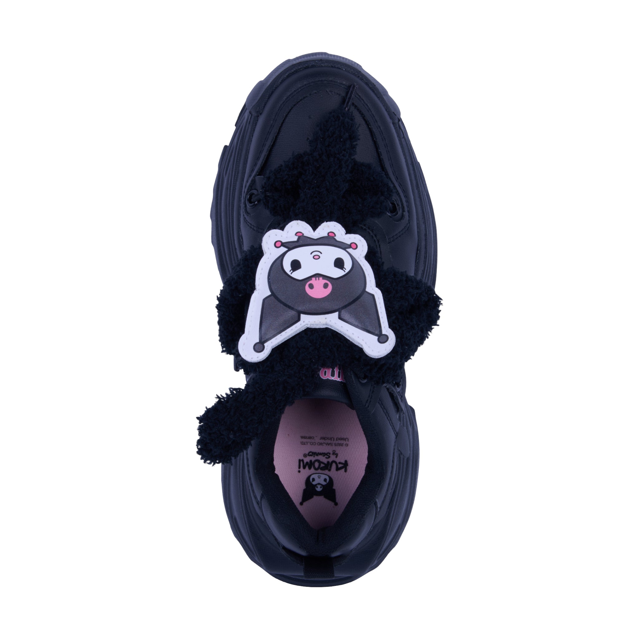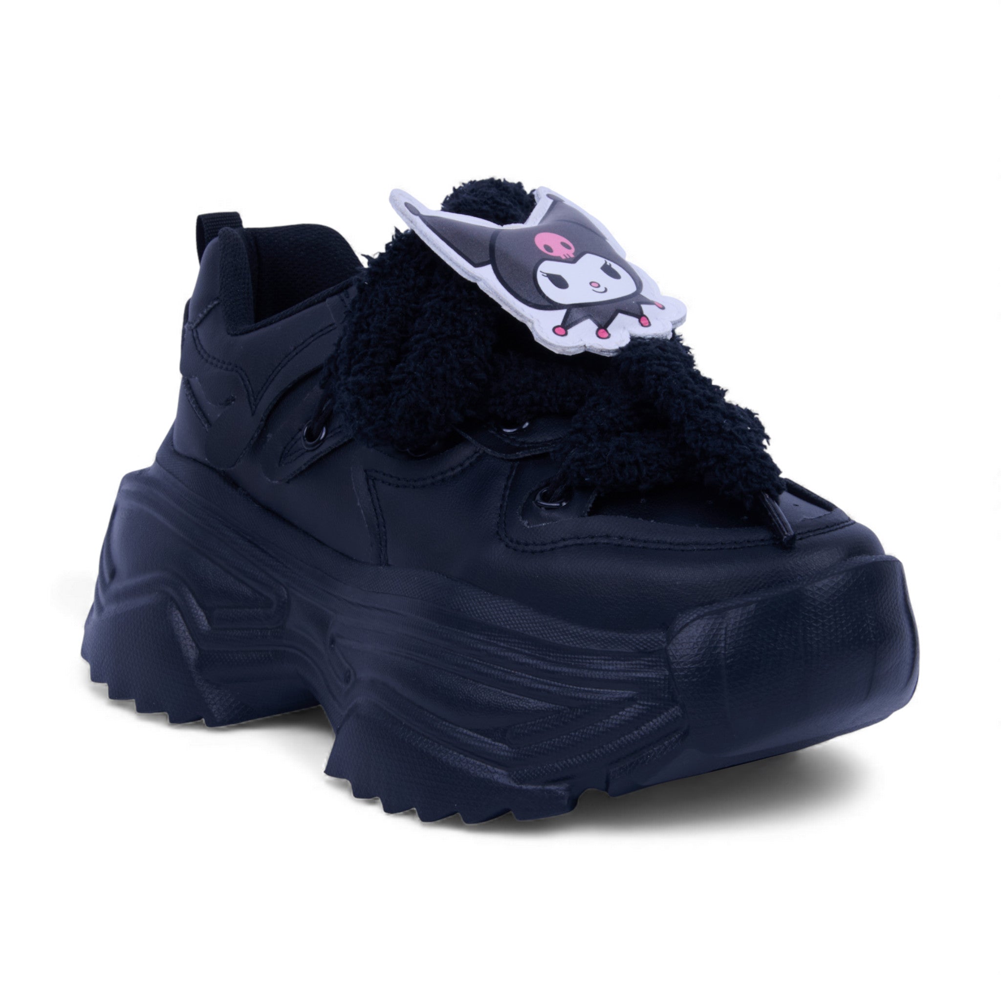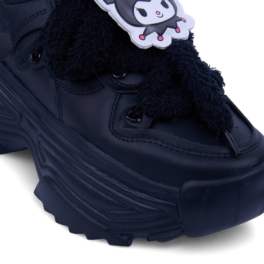 Tenis negro con diseño inspirado en Kuromi, personaje de Sanrio. Fabricados en material sintético con agujetas acolchadas y plataforma de 4.5 cm que brinda altura y estilo. Incluyen pin decorativo de Kuromi que aporta un toque divertido y original. Suela resistente y cómoda para uso diario con un look moderno y juvenil.