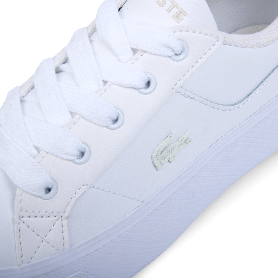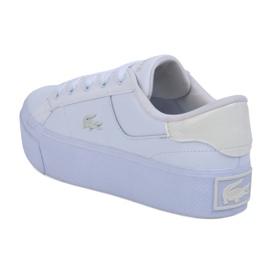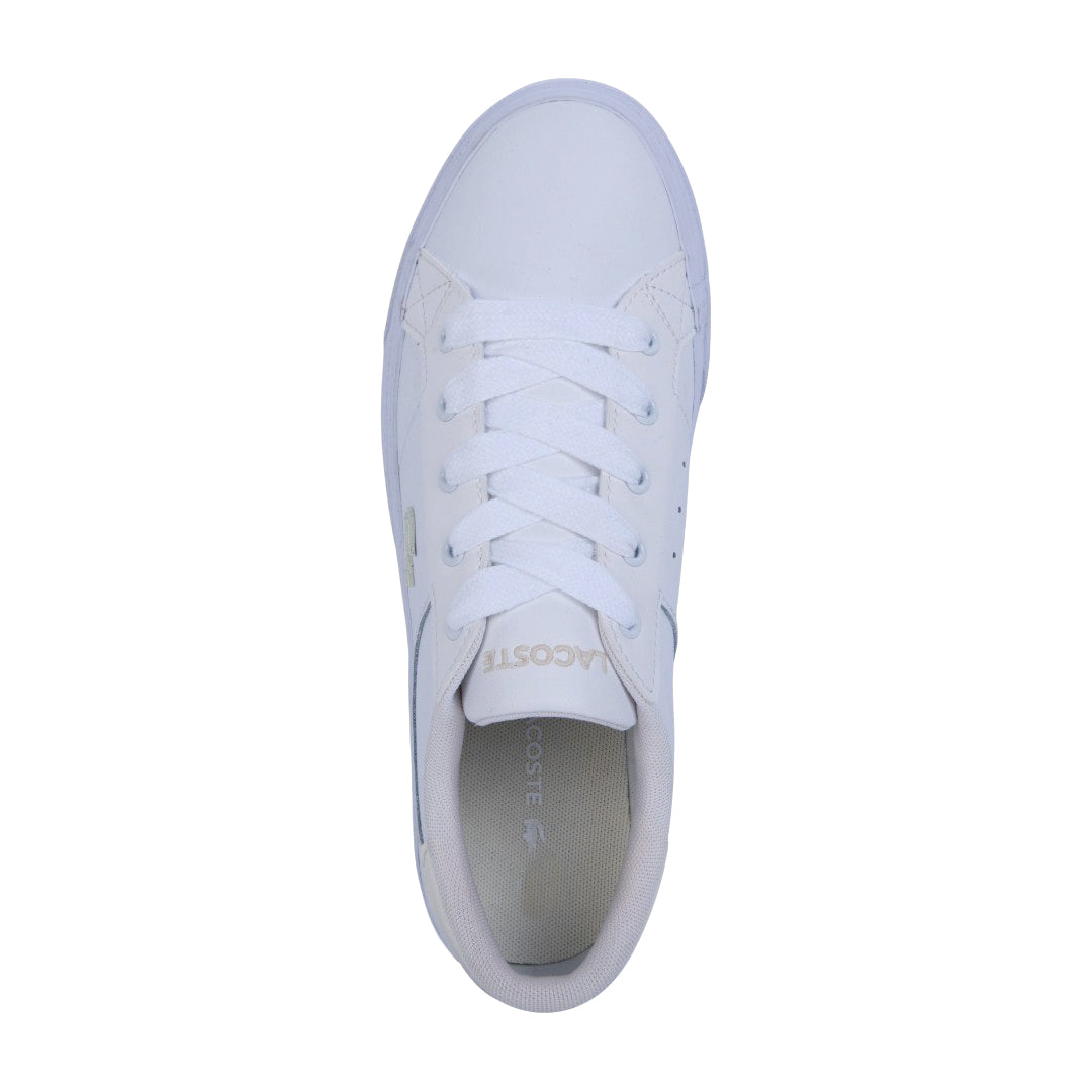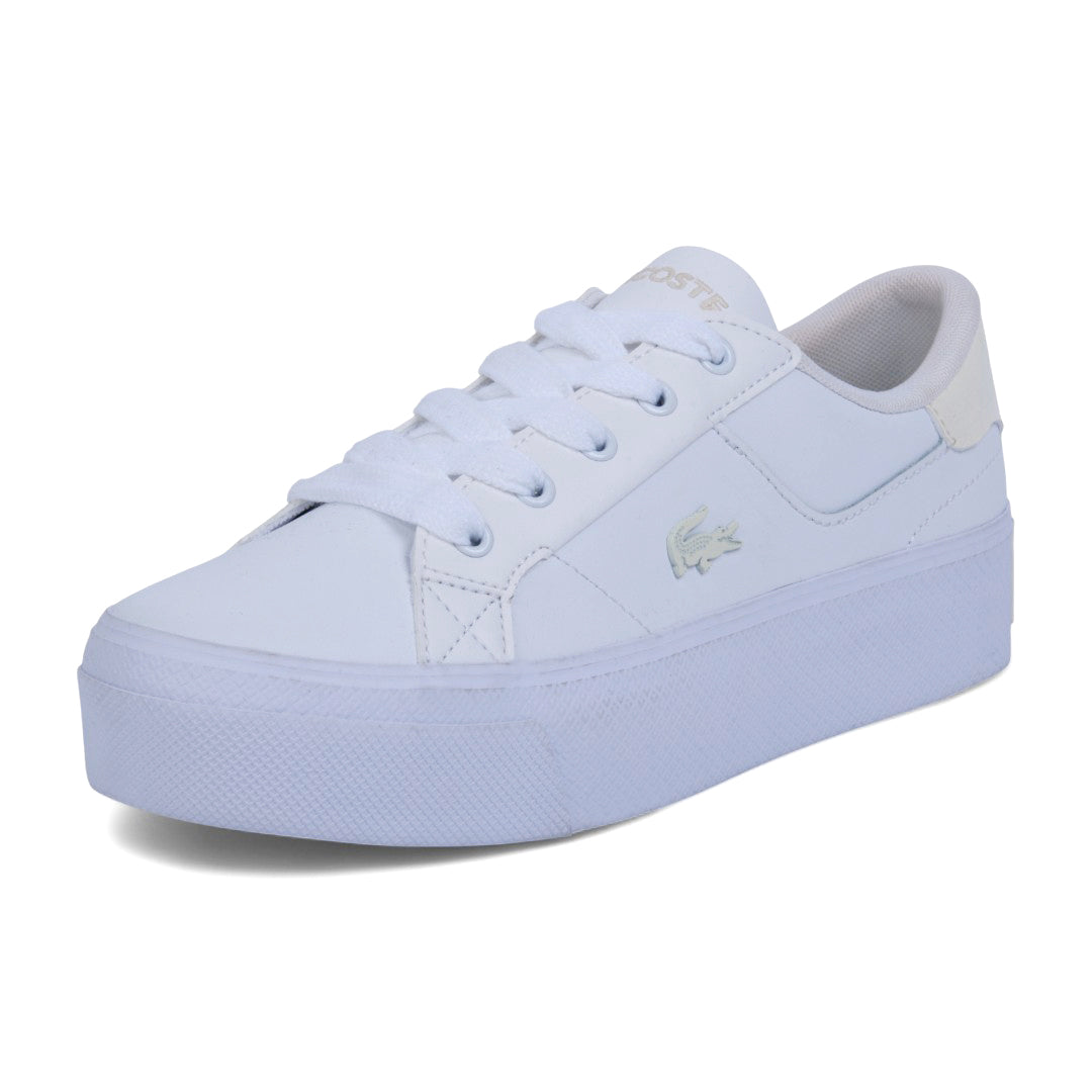 Tenis casual Lacoste para dama en color blanco, confeccionados en piel de alta calidad con material transpirable y suela antiderrapante que garantiza seguridad y confort. Incluye cinta lateral ajustable con el logo distintivo de la marca. Un diseño clásico, versátil y sofisticado ideal para cualquier ocasión.