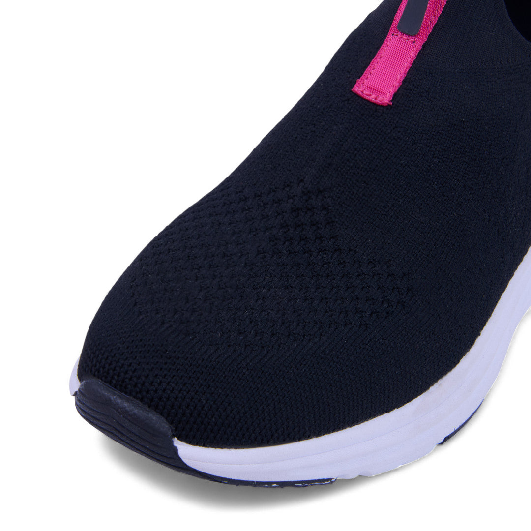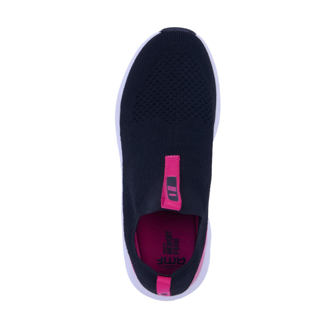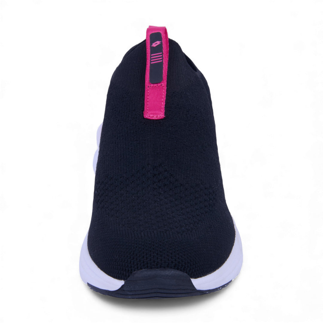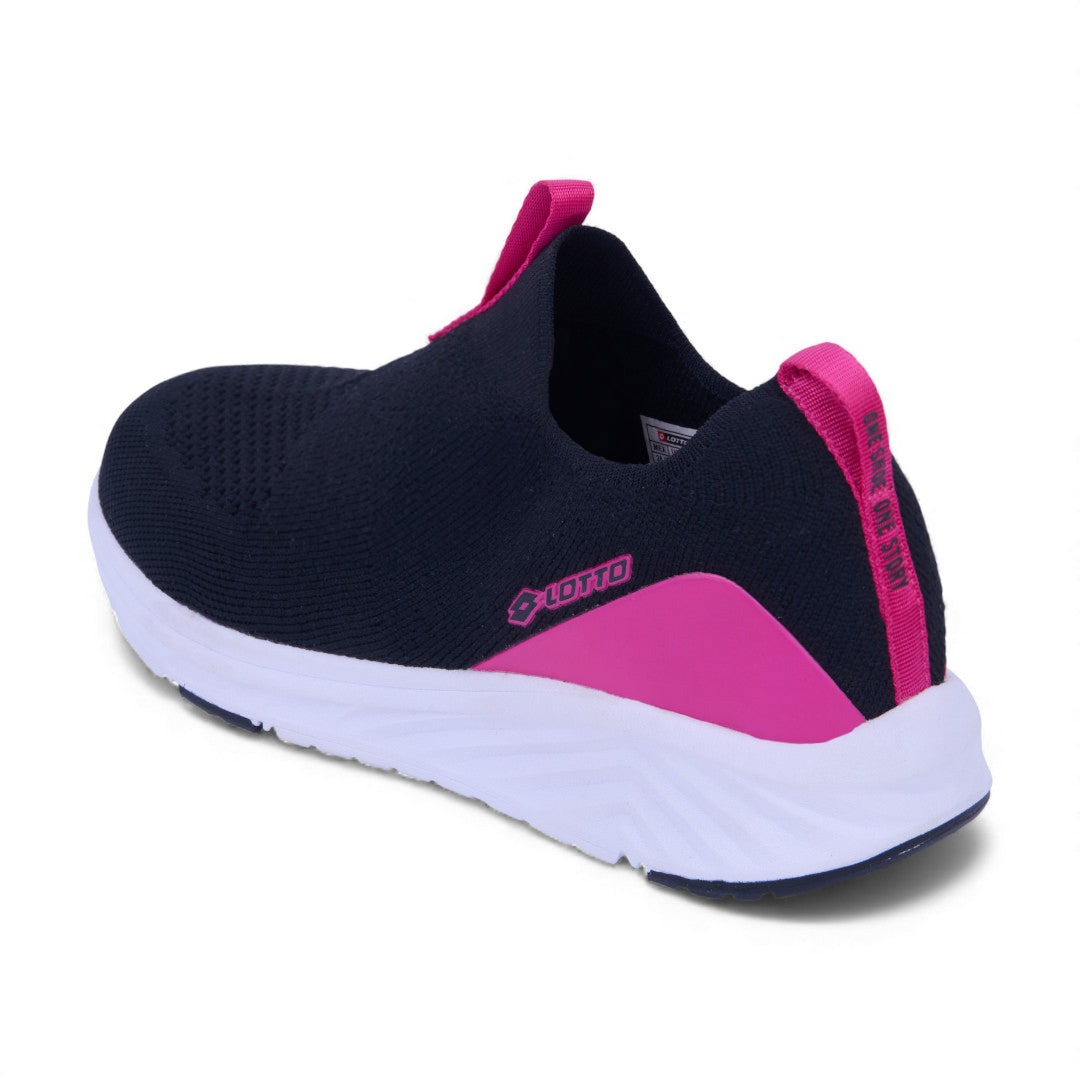 Tenis Lotto negros estilo slip-on con malla transpirable, logo frontal y suela ligera antiderrapante; confortables, flexibles y fáciles de calzar.
