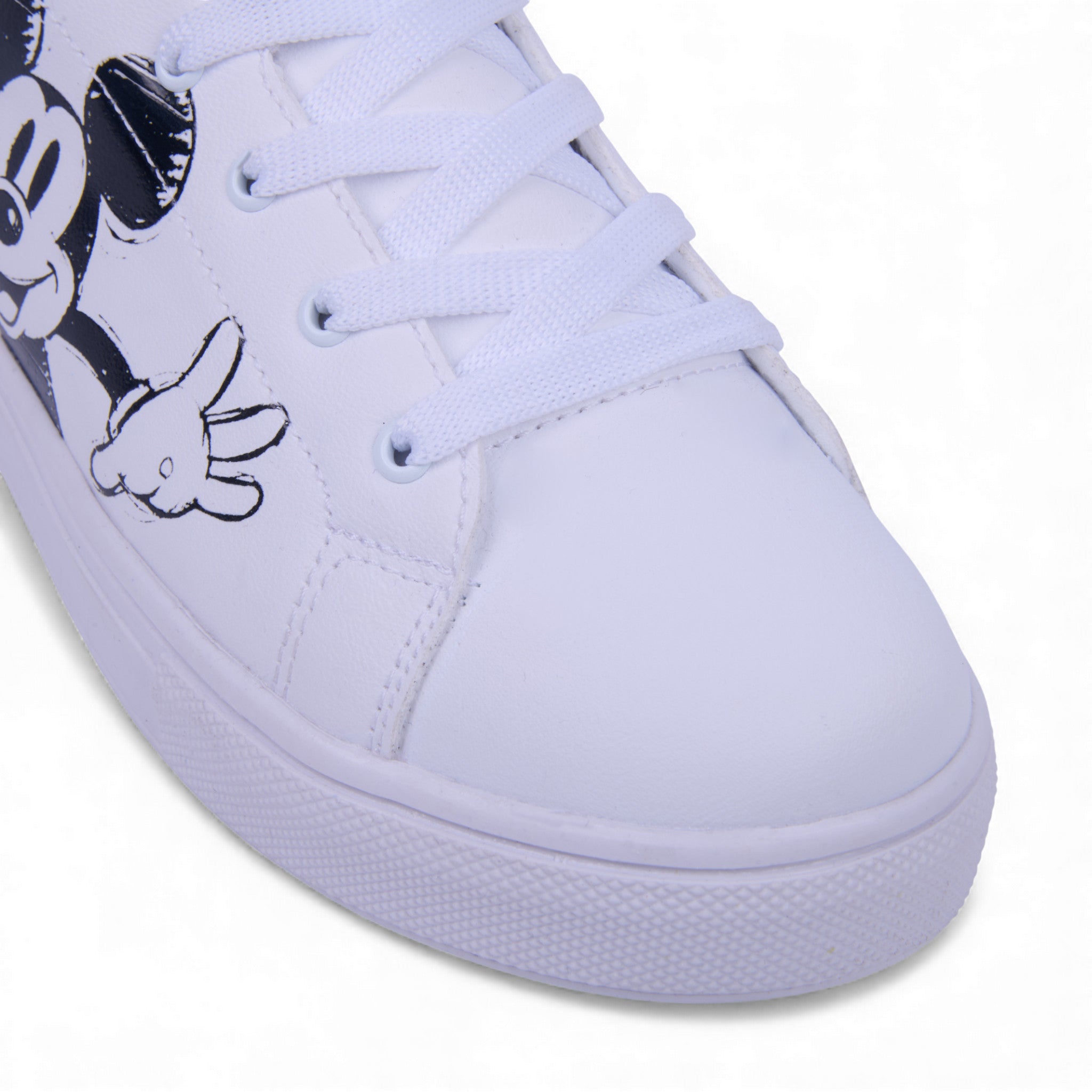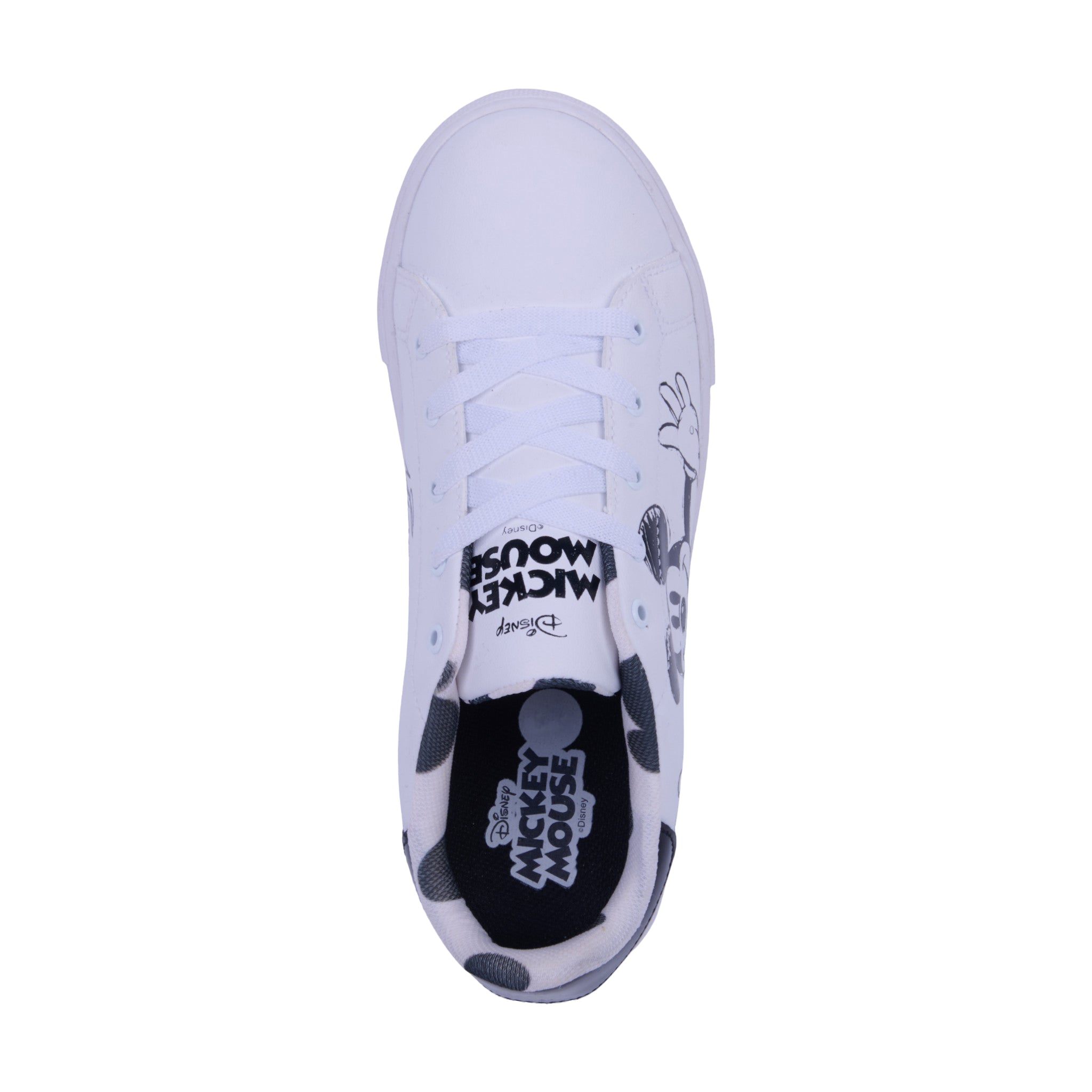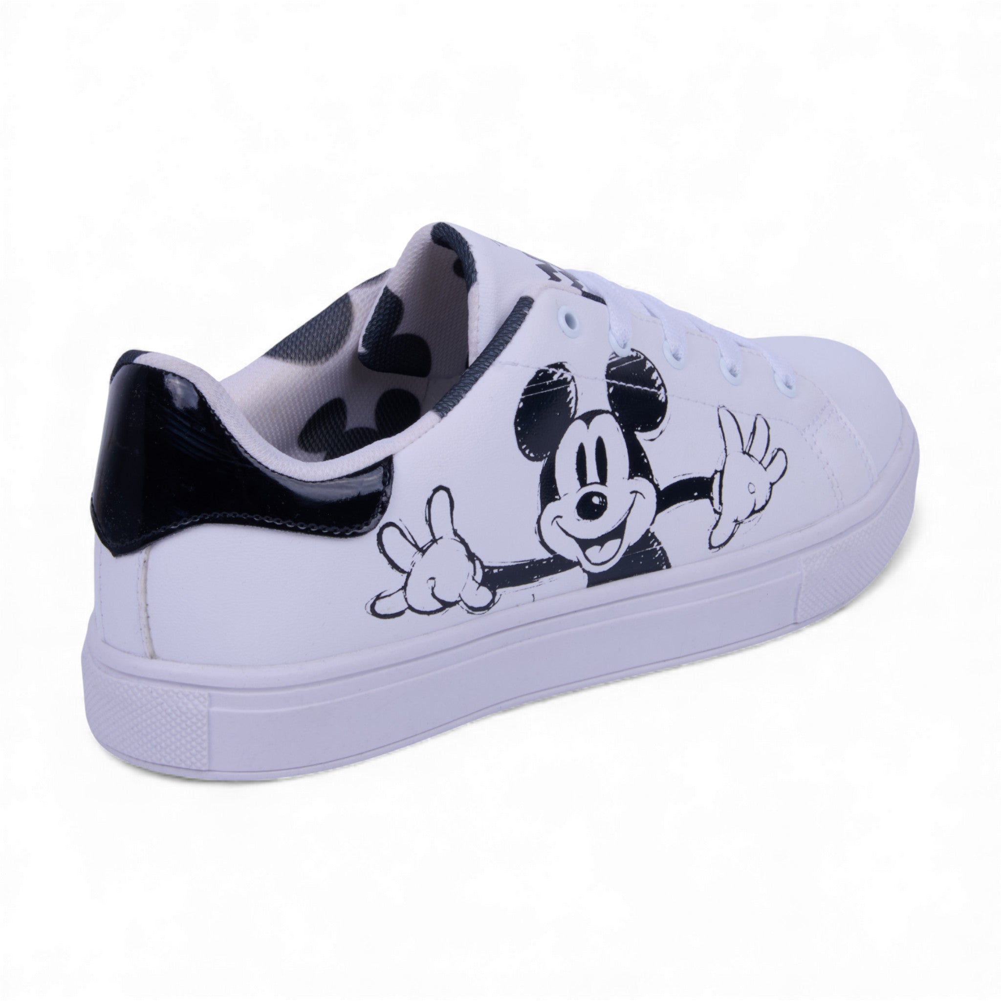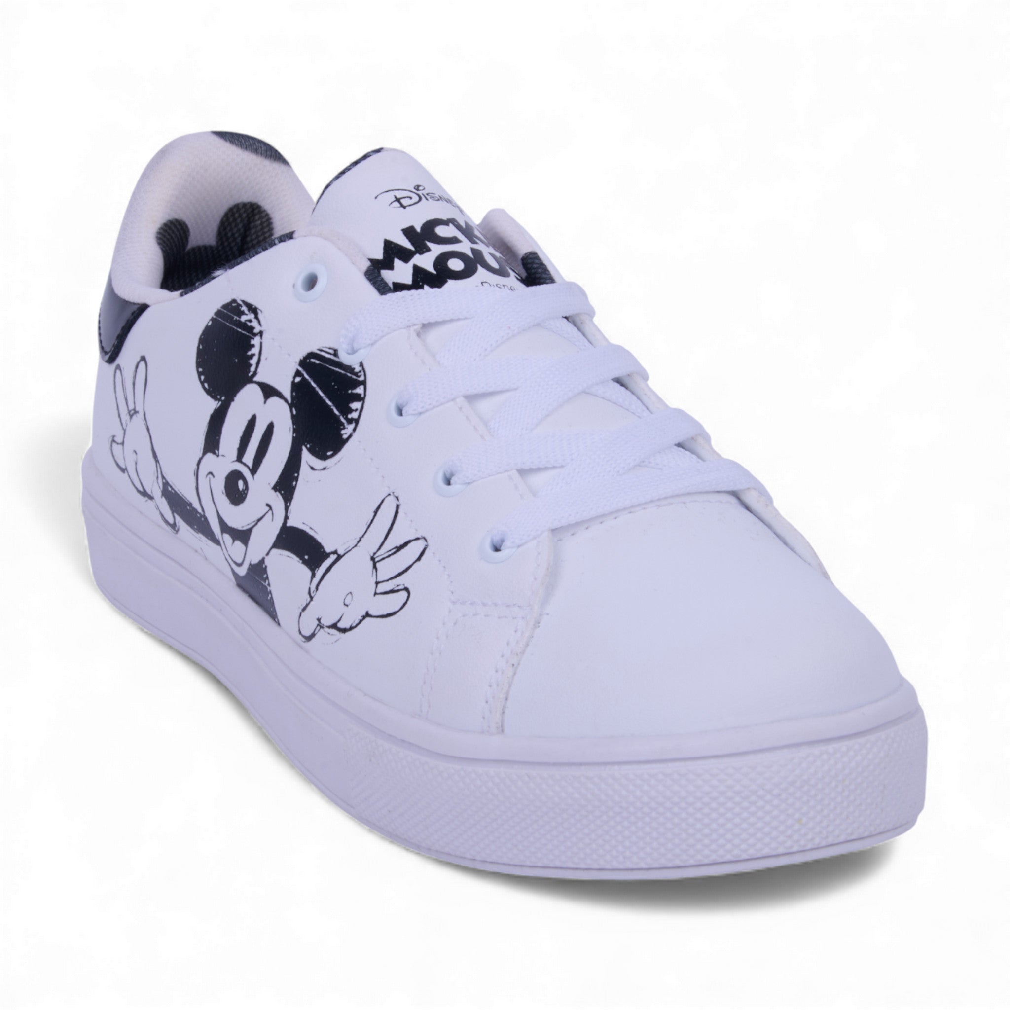 Tenis color blanco con gráficos de Mickey Mouse en un costado y forro textil estampado. Fabricado en corte sintético con interior suave que brinda comodidad y ligereza. Su diseño moderno y divertido es ideal para un look casual, urbano o para los amantes de Disney que buscan estilo y confort.