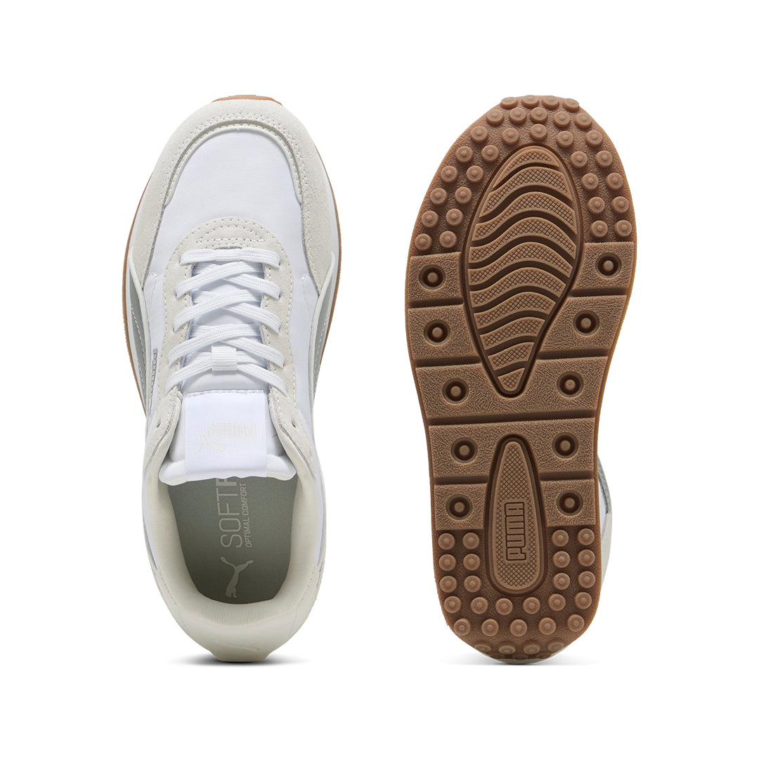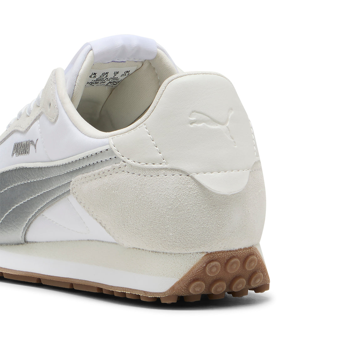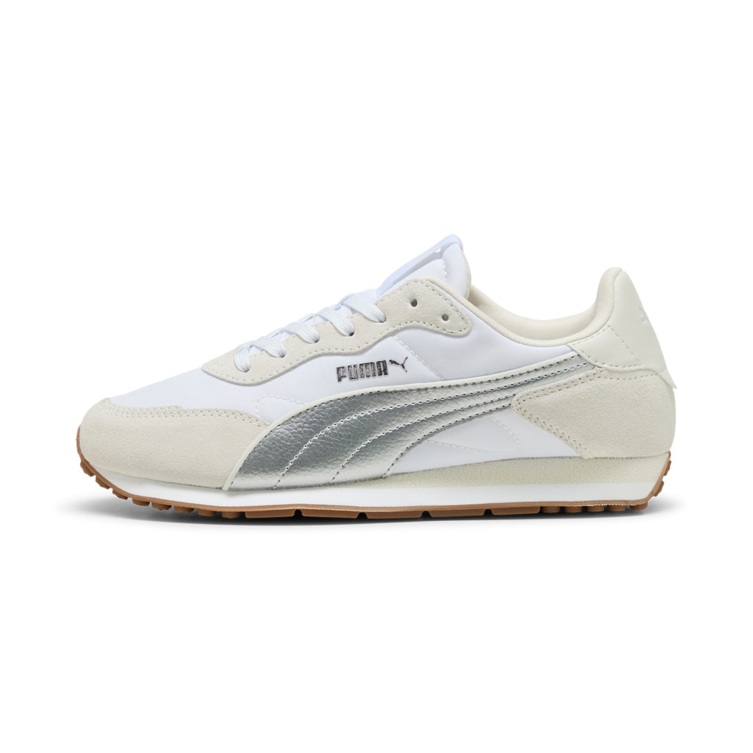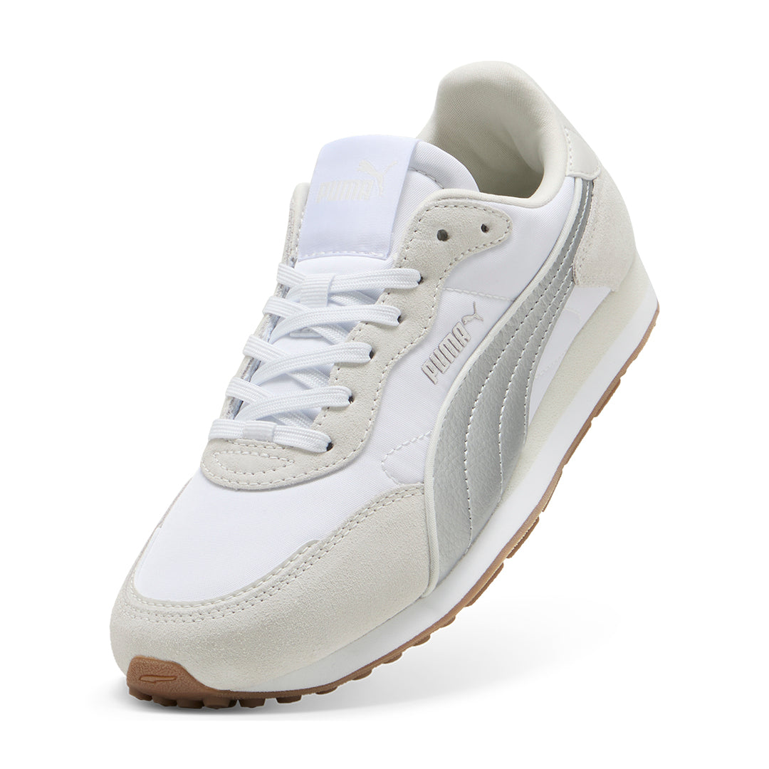 Tenis Puma multicolor con cintas ajustables, franja lateral distintiva y contraste en plata; diseño vibrante, moderno y cómodo con tela ligera.