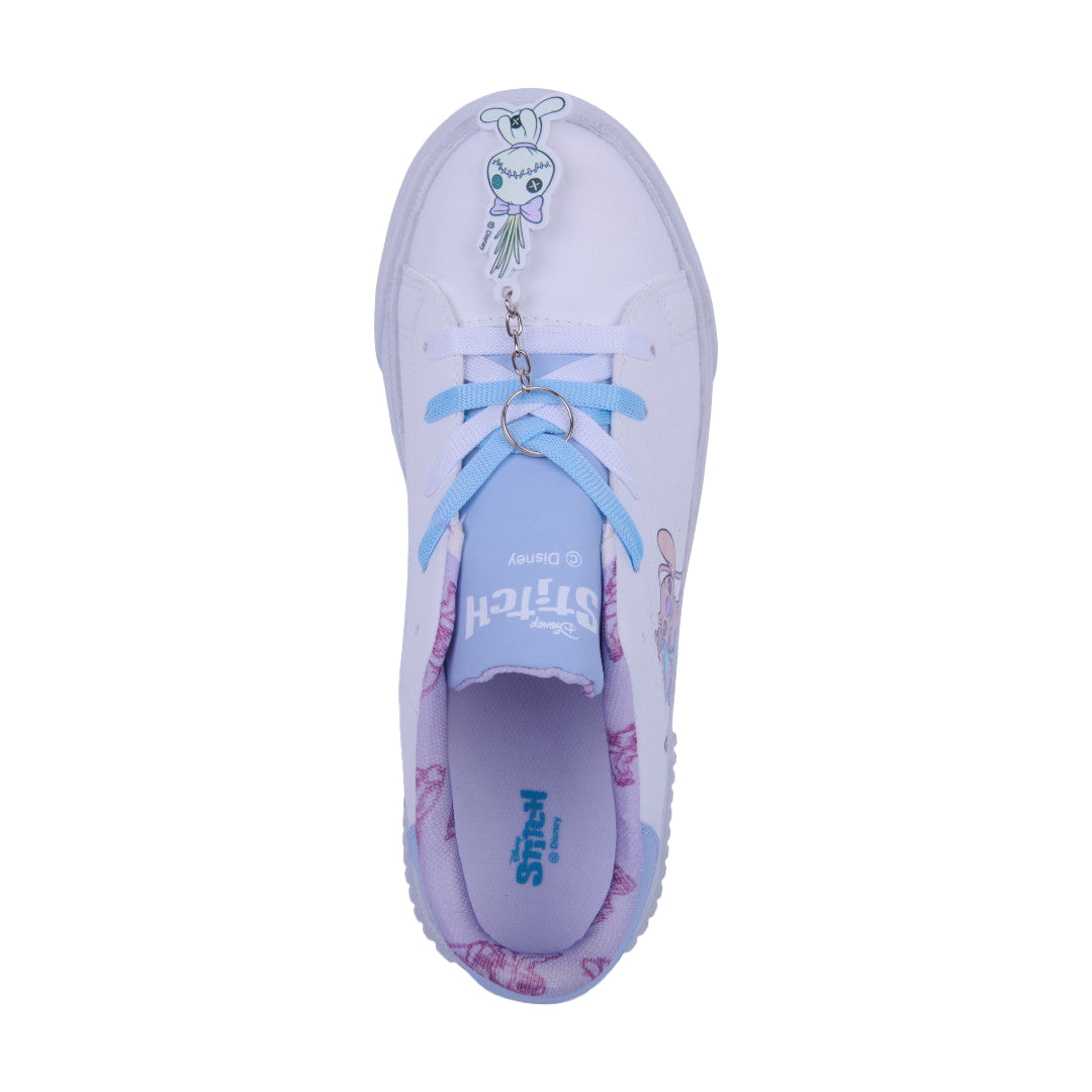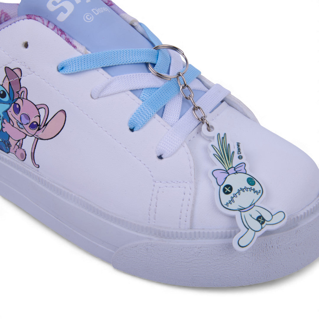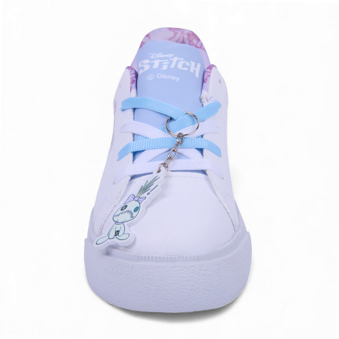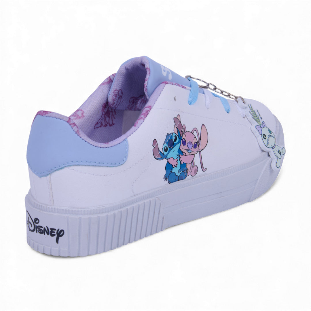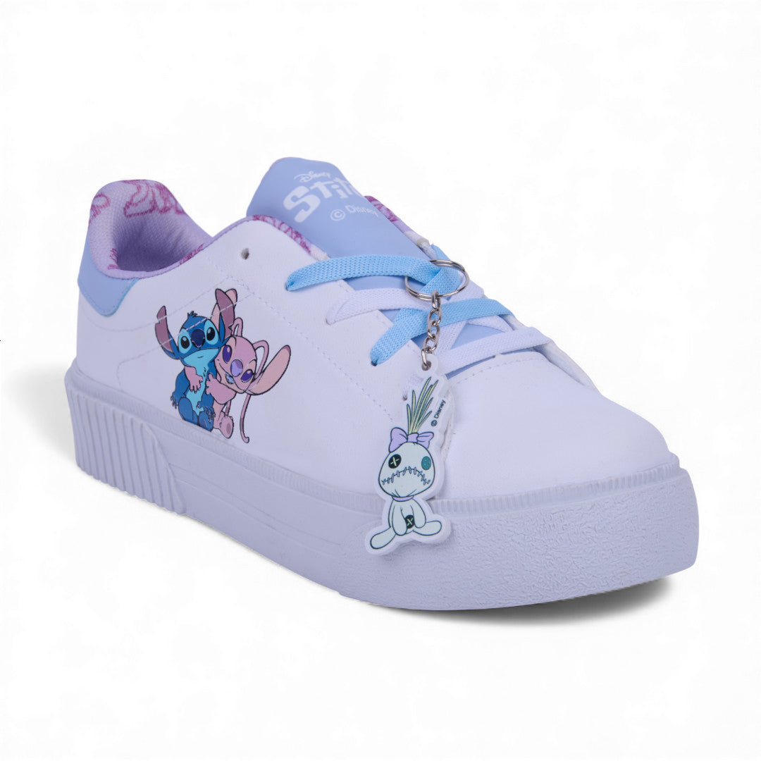 Tenis color blanco con gráficos de Stitch en un costado. Elaborado en corte sintético con forro textil suave que brinda confort y transpirabilidad. Su diseño moderno y tierno es ideal para los fans de Disney que buscan un look casual, juvenil y lleno de personalidad.