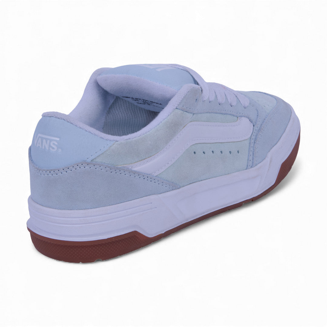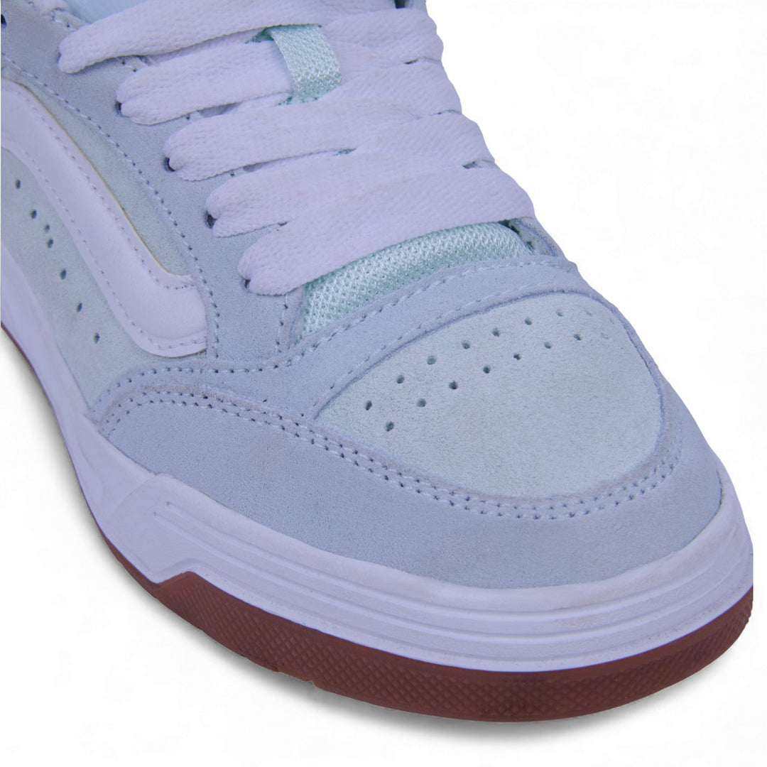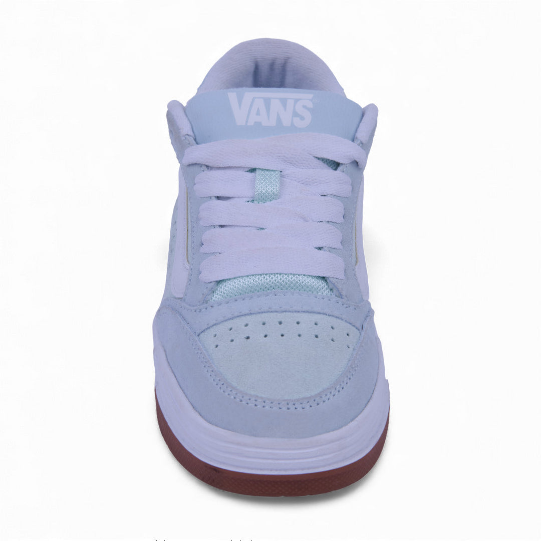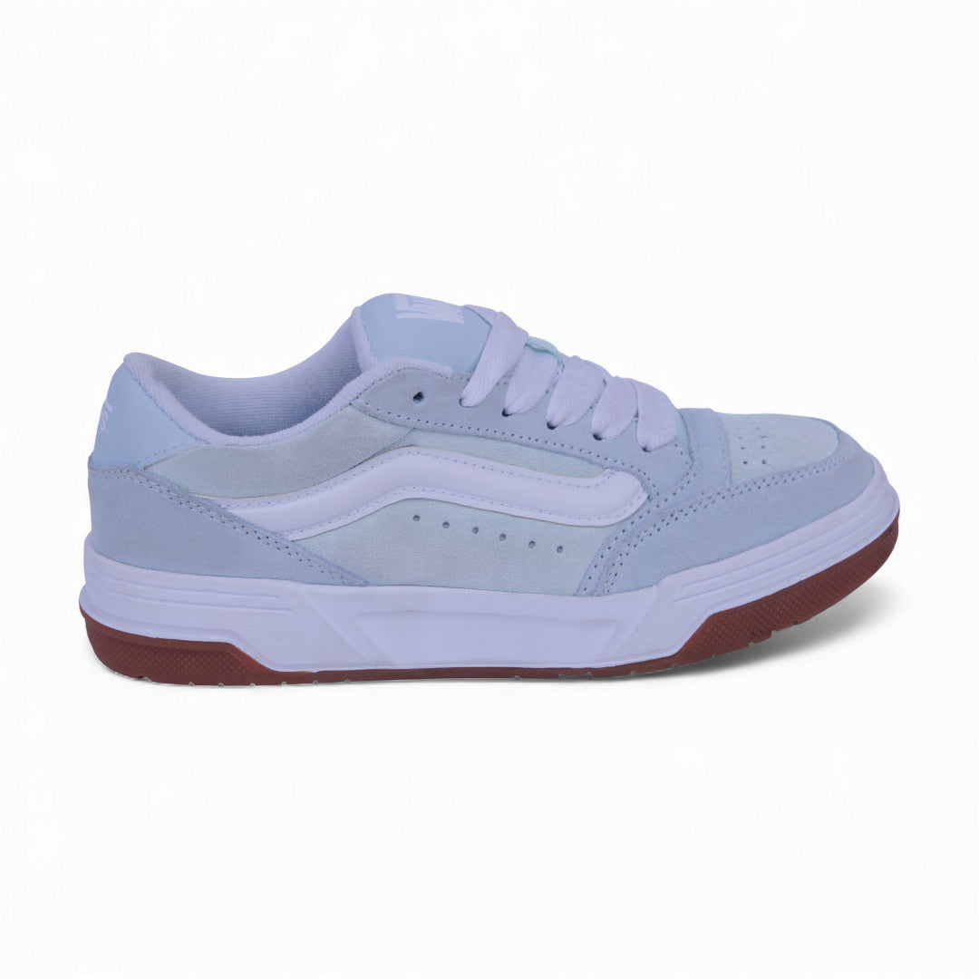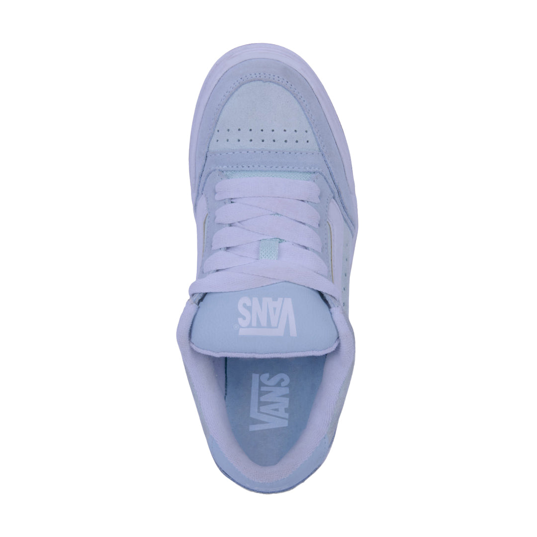 Tenis Vans para dama en color azul, con suela blanca de perfil alto y diseño de malla texturizada combinada con detalles en gamuza. Incluyen franjas distintivas laterales, agujetas blancas en contraste y costuras decorativas. Un estilo moderno, urbano y femenino ideal para uso diario.