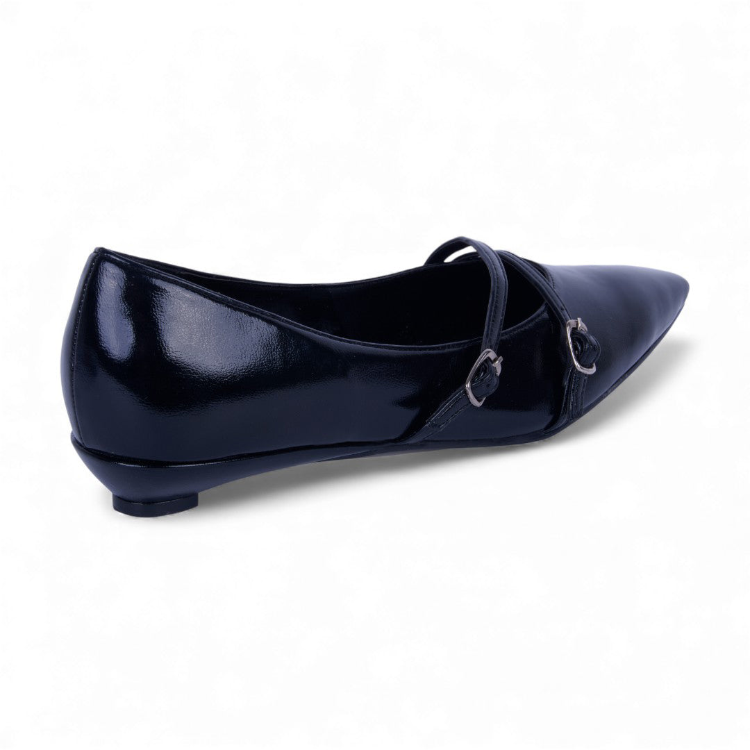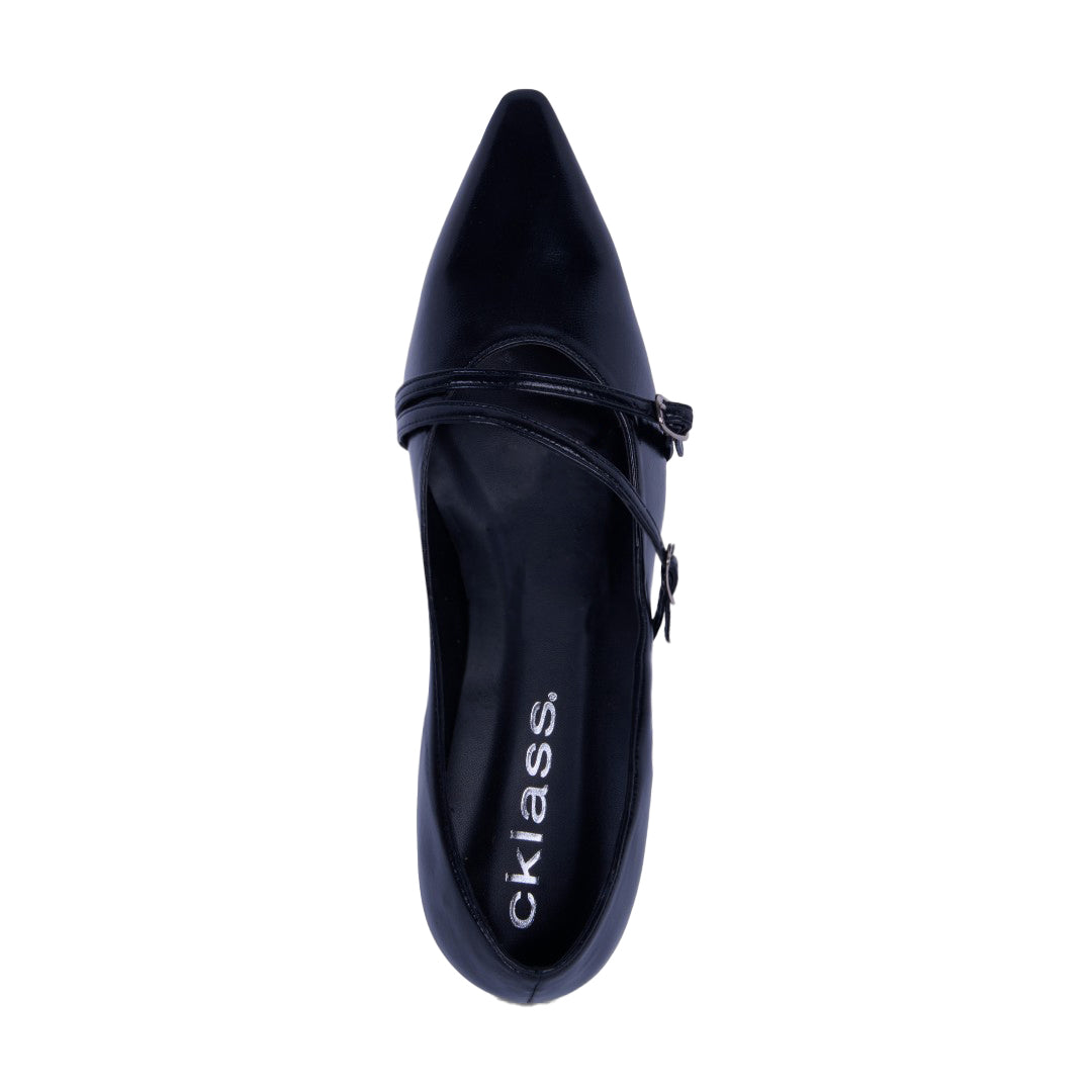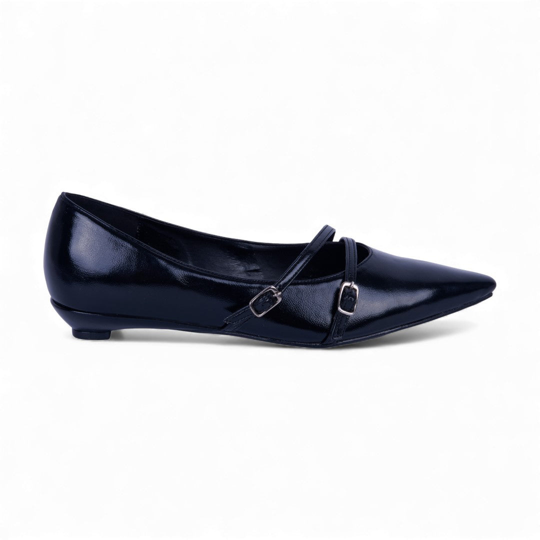 Zapatilla de tacón bajo de 2 cm color negro con elegantes látigos y hebillas decorativas. Diseño con puntal que aporta un estilo sofisticado y femenino. Fabricada en material sintético con plantilla suave para una pisada cómoda. Ideal para looks formales o casuales con un toque moderno y versátil.