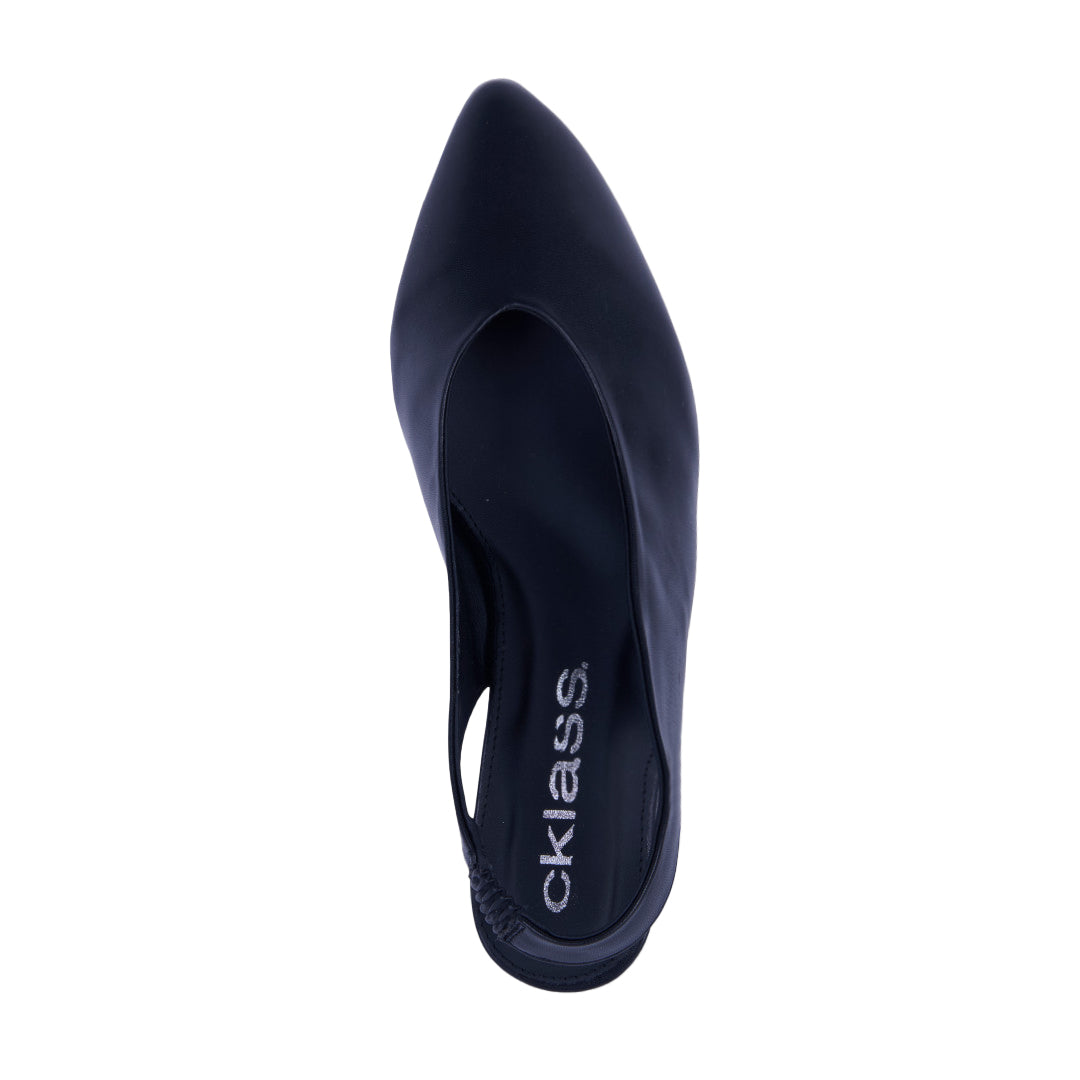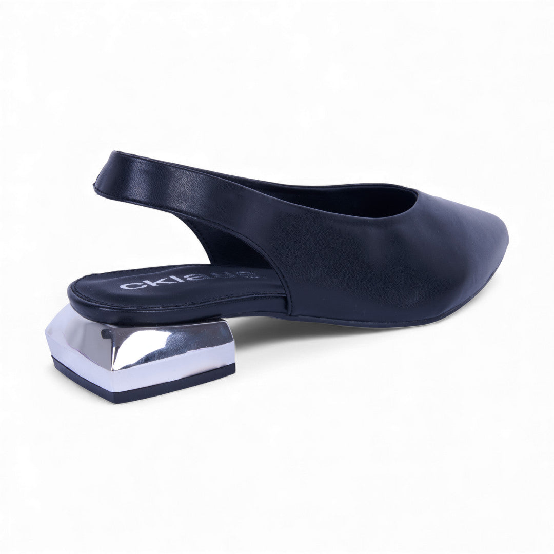 Zapatilla negra destalonada de 3 cm con detalle metálico en tacón y pulsera ajustable; diseño elegante, moderno y cómodo para eventos o uso diario.