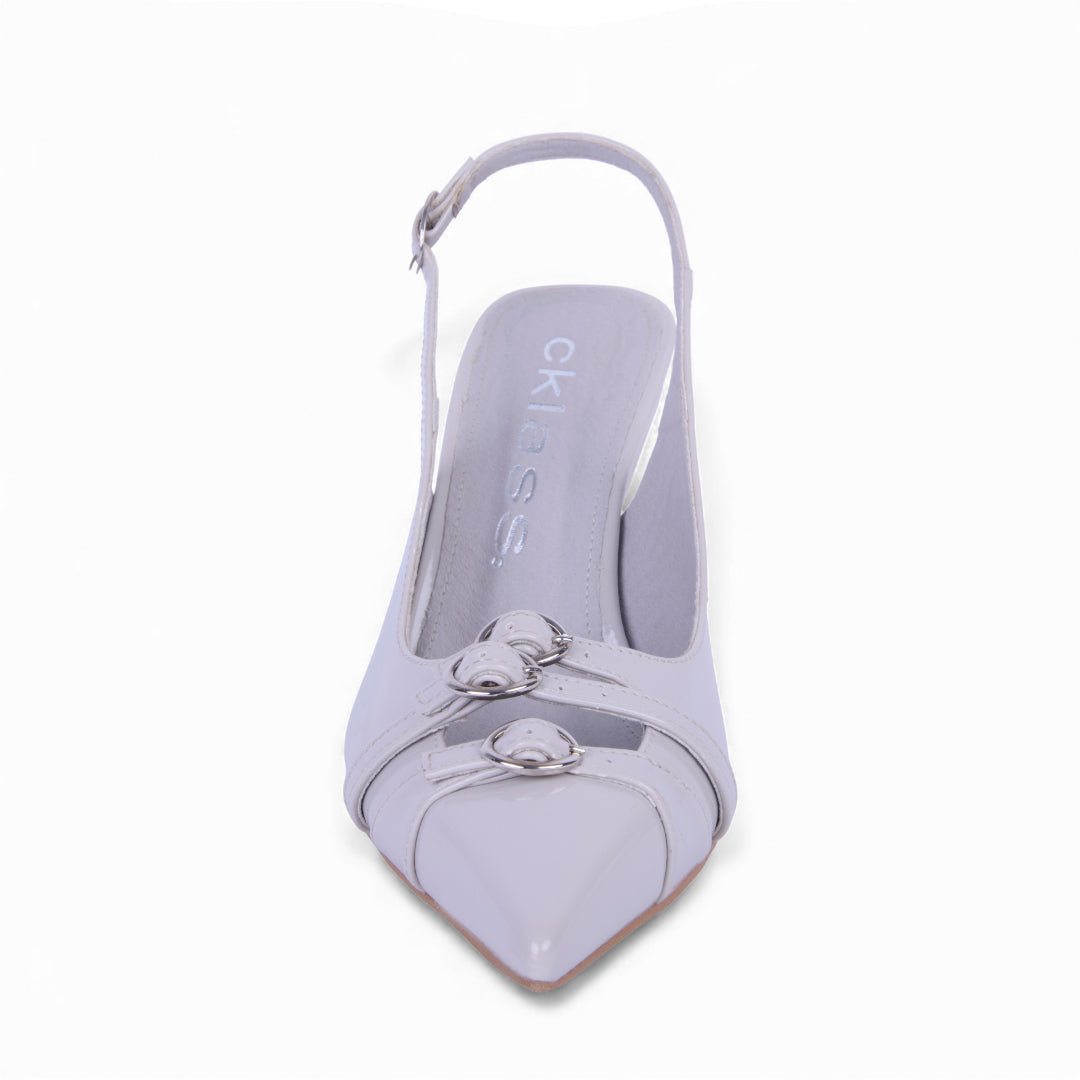 Zapatilla de tacón gris de 10 cm con tiras elegantes y adorno frontal que realza el diseño. Moderna, femenina y perfecta para eventos y looks sofisticados.