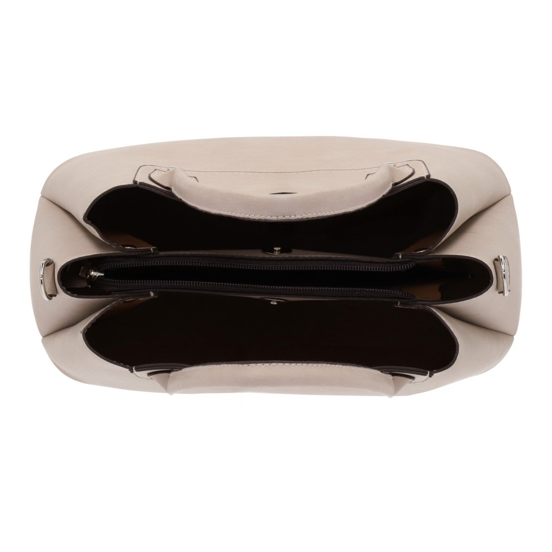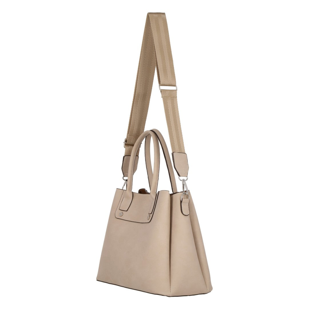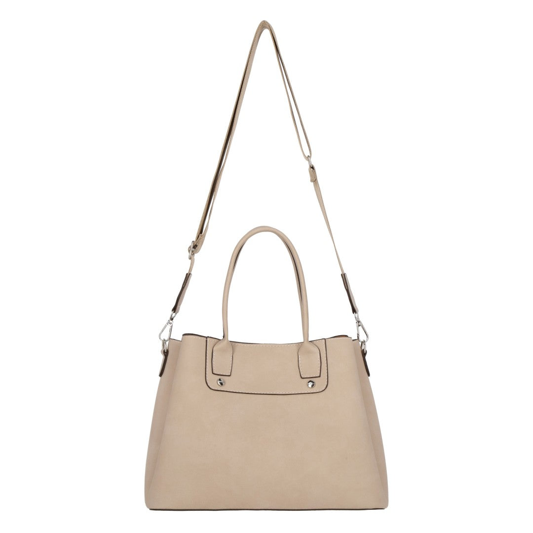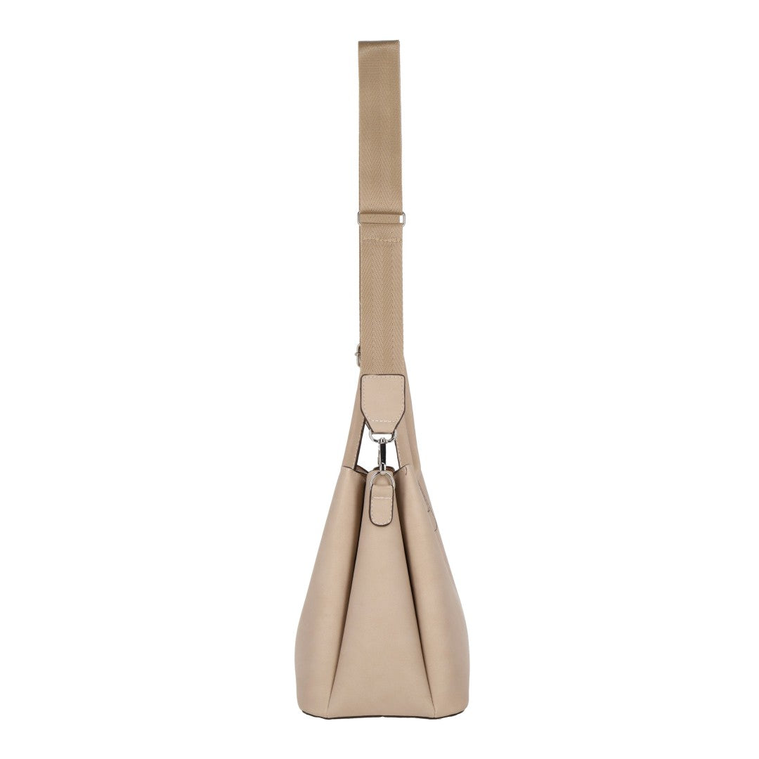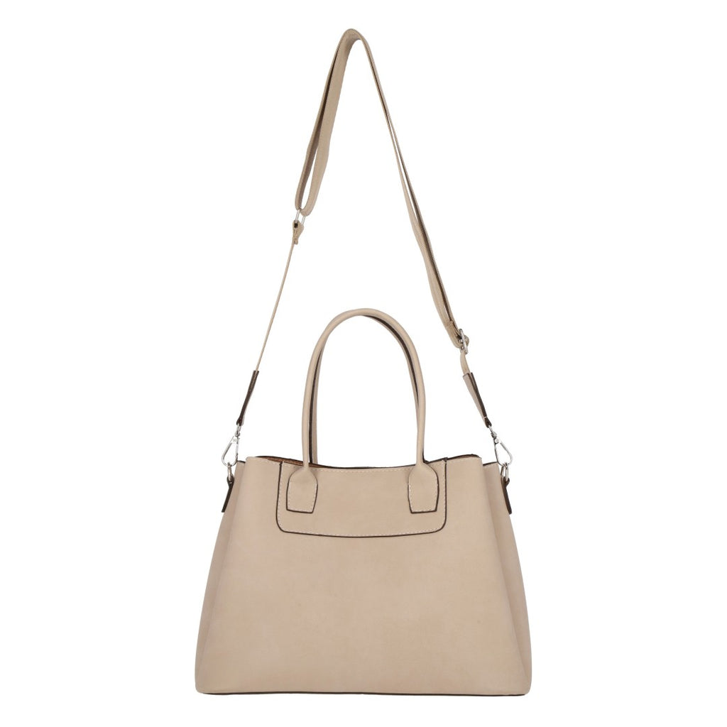 Bolso color beige con asa larga desmontable y detalles en contraste color chocolate; diseño práctico y elegante para uso diario.