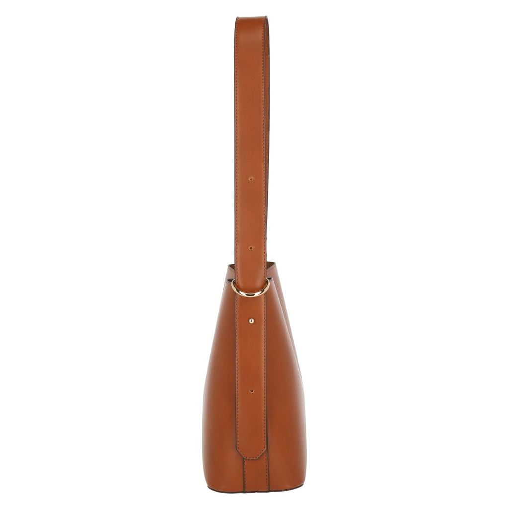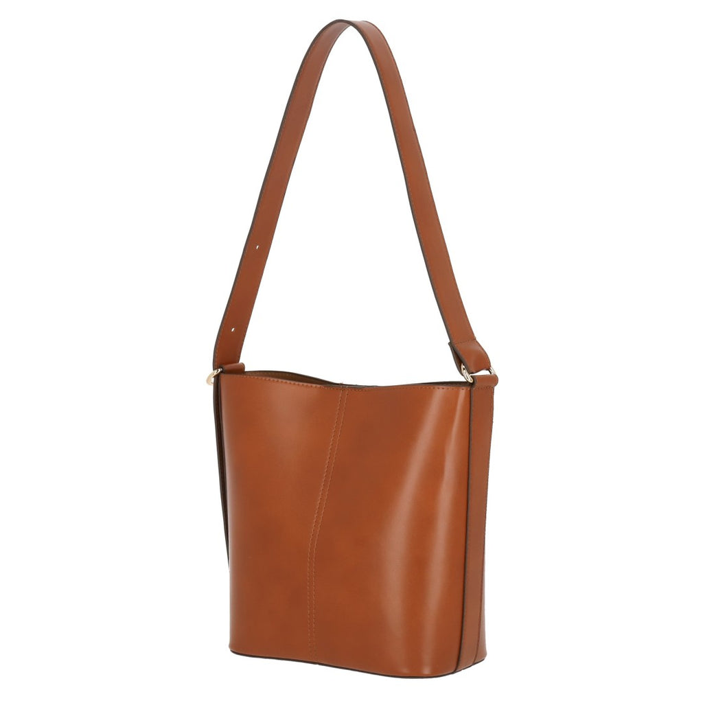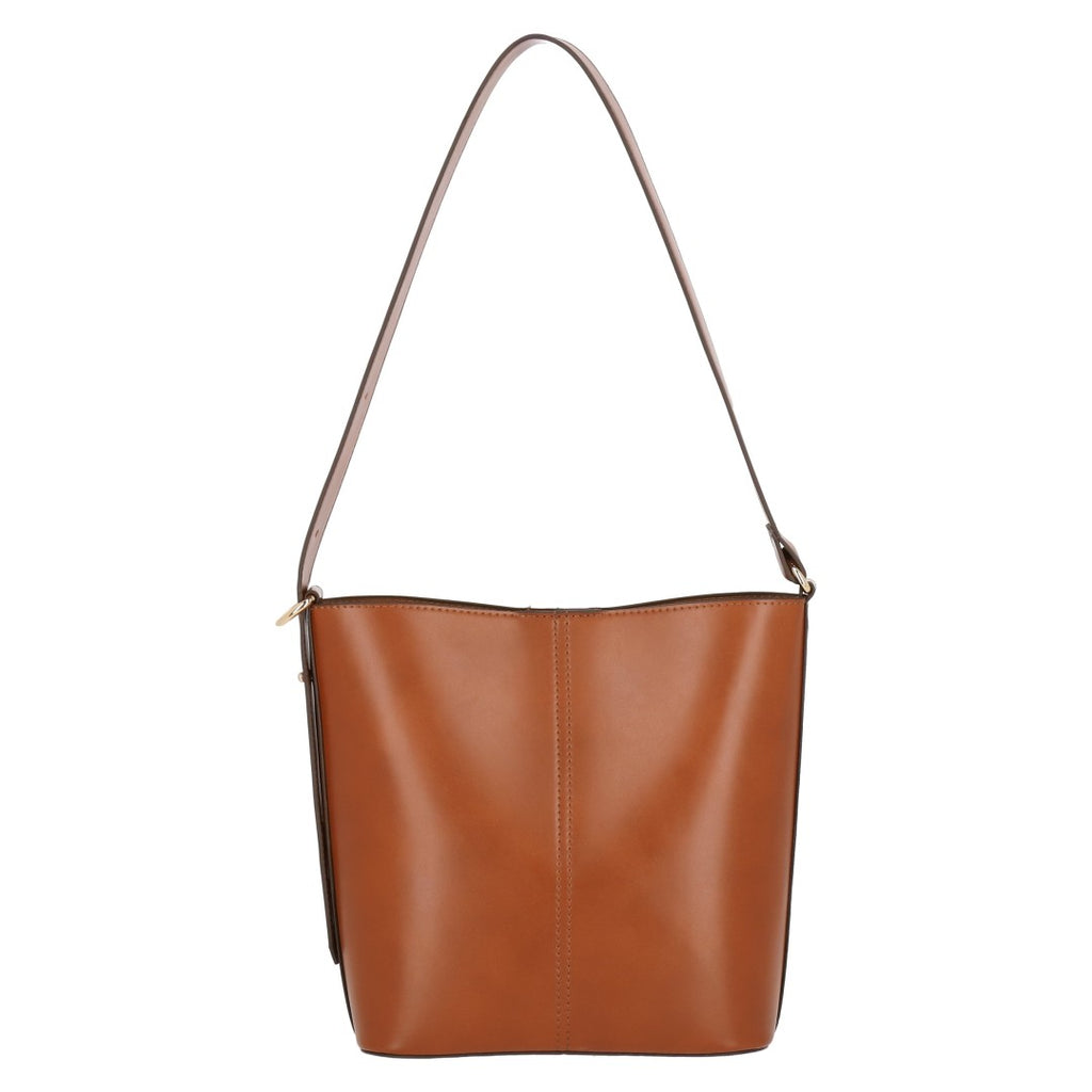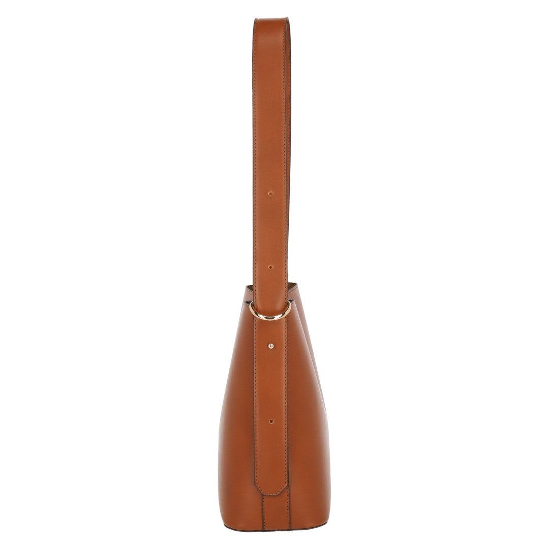 Bolso tipo bucket bag color miel para dama, con correa ajustable y exterior sintético resistente. Ideal como bolso casual mujer, elegante y práctico para uso diario o salidas informales.