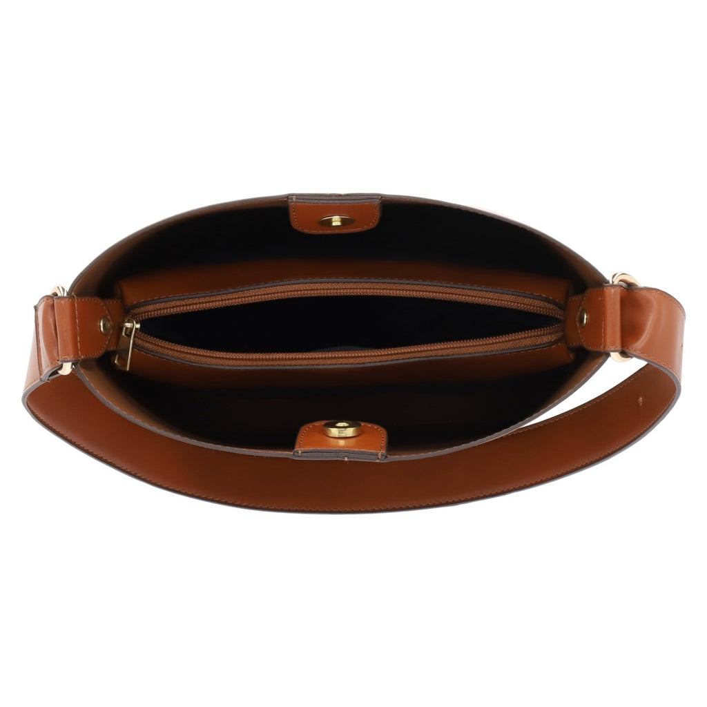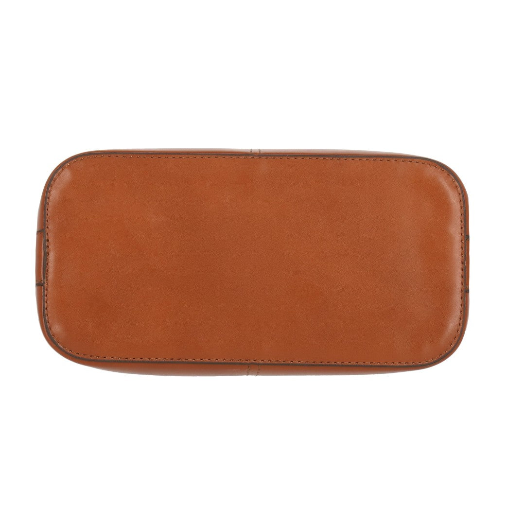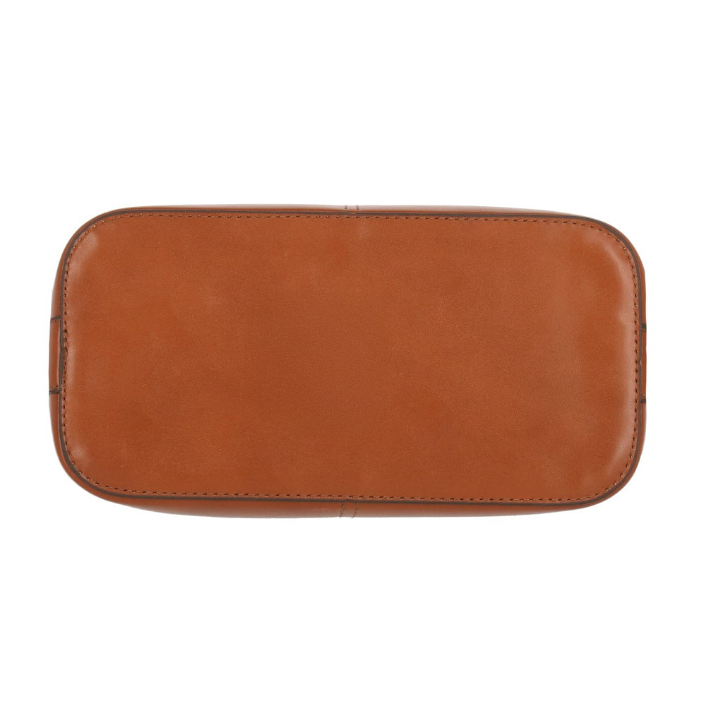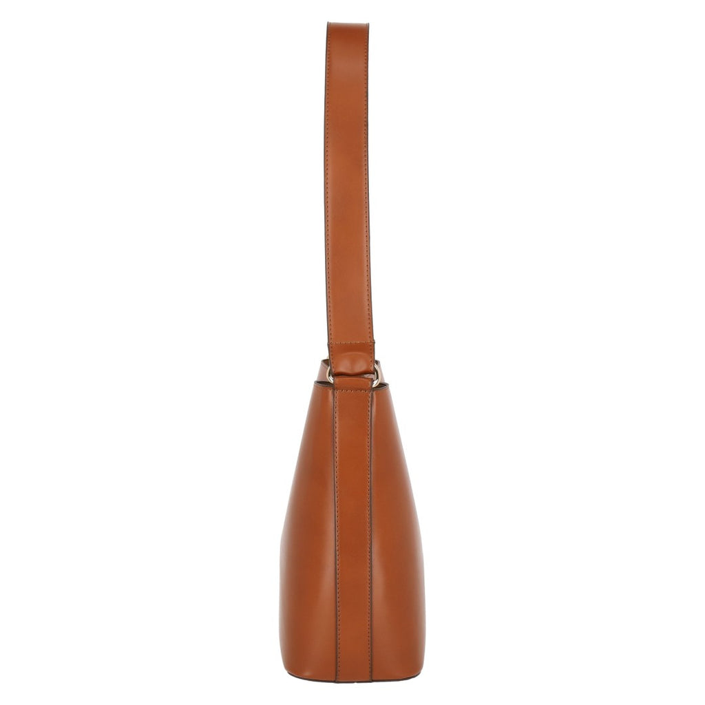 Bolso tipo bucket bag color miel para dama, con correa ajustable y exterior sintético resistente. Ideal como bolso casual mujer, elegante y práctico para uso diario o salidas informales.