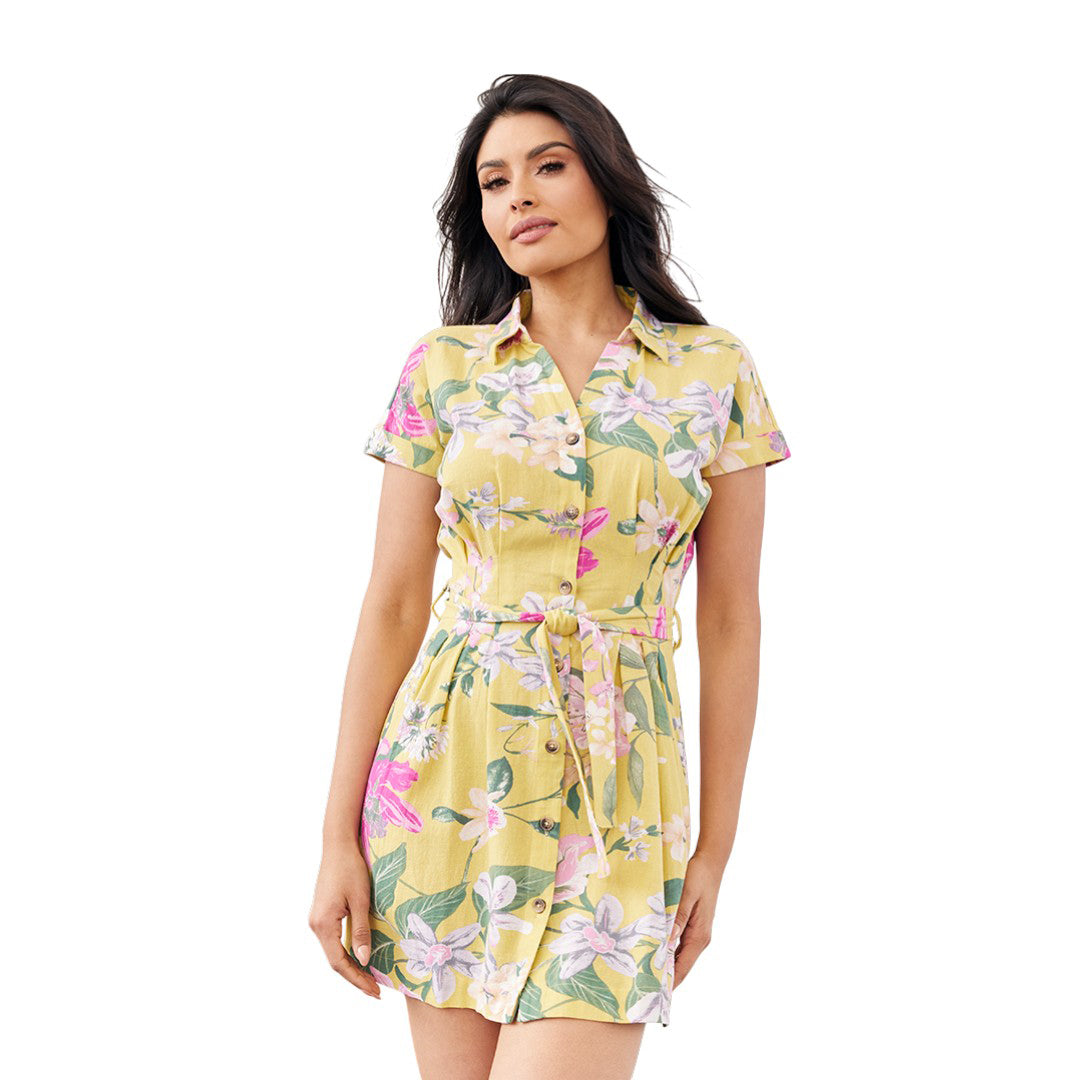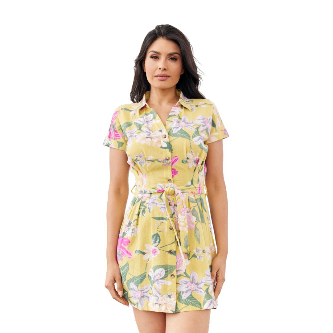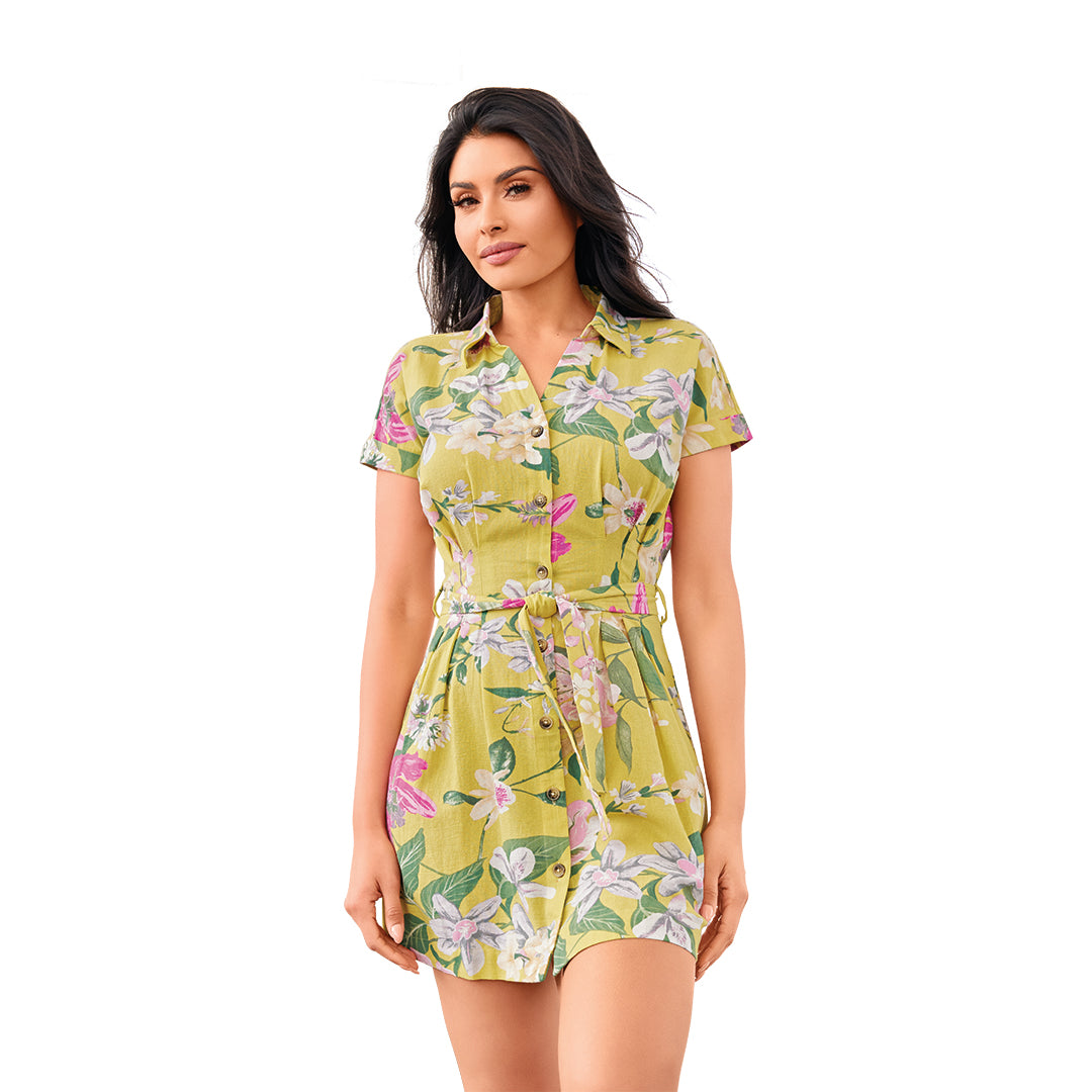 Vestido corto para dama confeccionado en algodón. Diseño camisero con botones frontales, manga corta y cinturón ajustable, estampado floral en tonos amarillo, rosa y verde. Estilo casual fresco, ideal para salidas y uso diario.