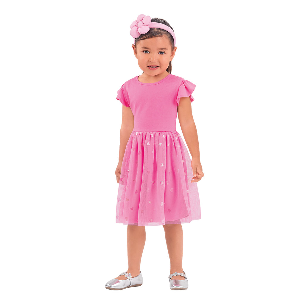 Vestido de cuello redondo, manga corta con olán, falda de tul con estampado de corazones metálicos. Materiales: Poliéster/Algodón.
